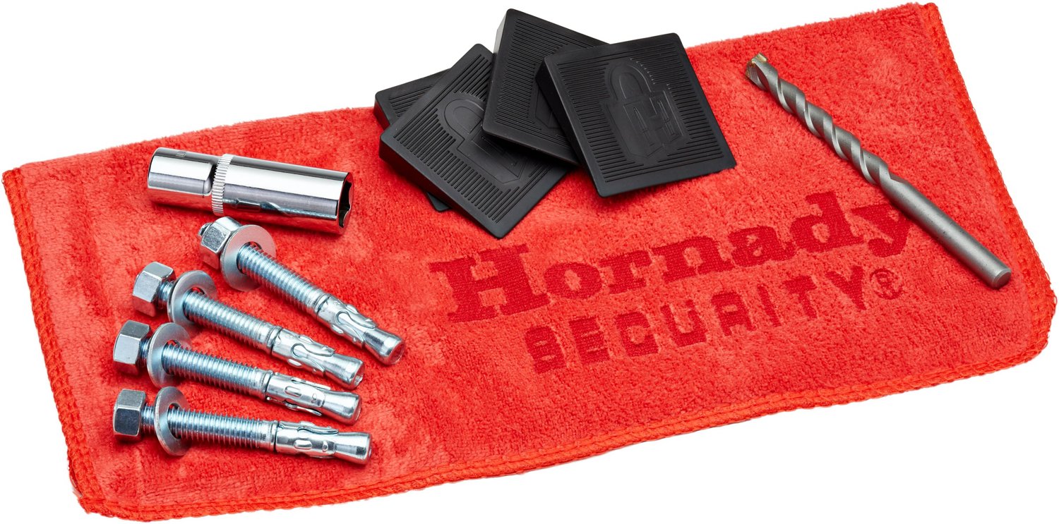 The Hornady Premium Safe Anchoring Kit includes everything needed to secure your Hornady Security safe to a concrete floor. The drive socket helps you tighten the bolts until the anchors expand into place, and the carbide bit is strong enough to drill precise holes into concrete flooring.
