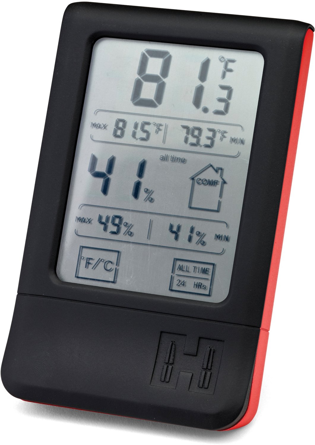 Protect your firearms and ammunition with the Hornady Red AAA Digital Hygrometer. This digital tool monitors the temperature and humidity in your gun safe, helping you maintain safe levels and avoid damage to delicate machinery. The quick-mount bracket and folding stand offer versatile mounting options, while a touchscreen display lets you easily read your results.