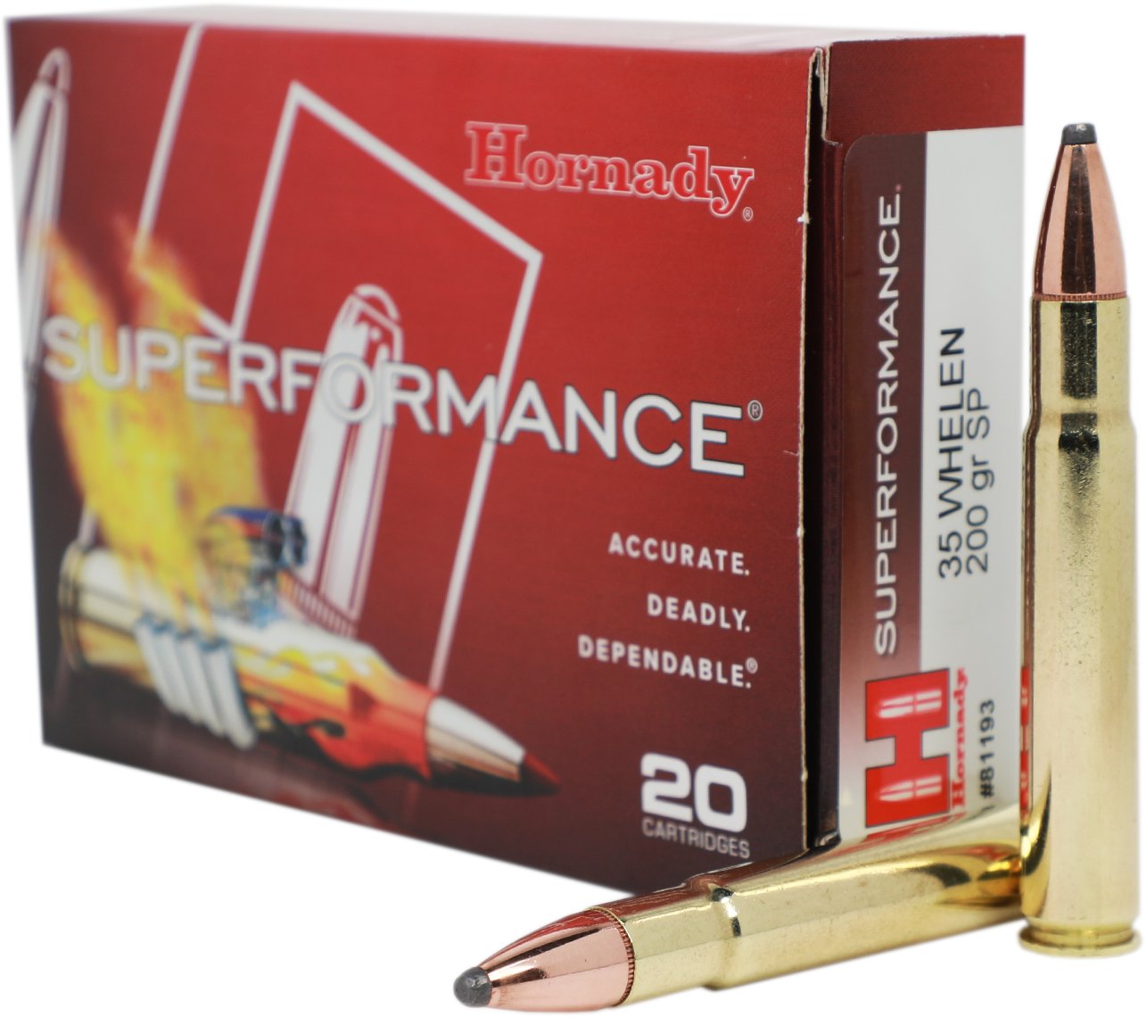 The Hornady SUPERFORMANCE .35 Whelen 200-Grain Rifle Ammunition - 20 Rounds is a high-performance centerfire ammunition that delivers up to 200 fps faster than conventional ammo. It features a soft point bullet that expands and penetrates deeply for effective hunting of medium and large game. The .35 Whelen caliber is suitable for rifles with a 1:12 twist rate or faster.