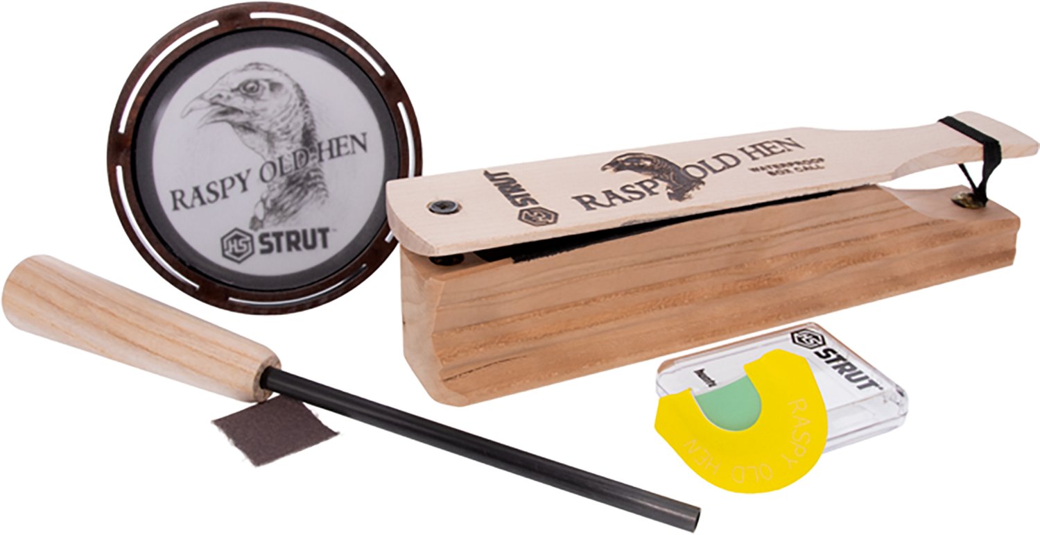 Start the season off right with this HS Strut Raspy Old Hen Combo Kit. Each kit includes 3 types of calls, the Raspy Old Hen box call, glass friction turkey calls and a Premium Flex diaphragm call, to recreate a variety of lifelike turkey sounds that attract birds to your location.