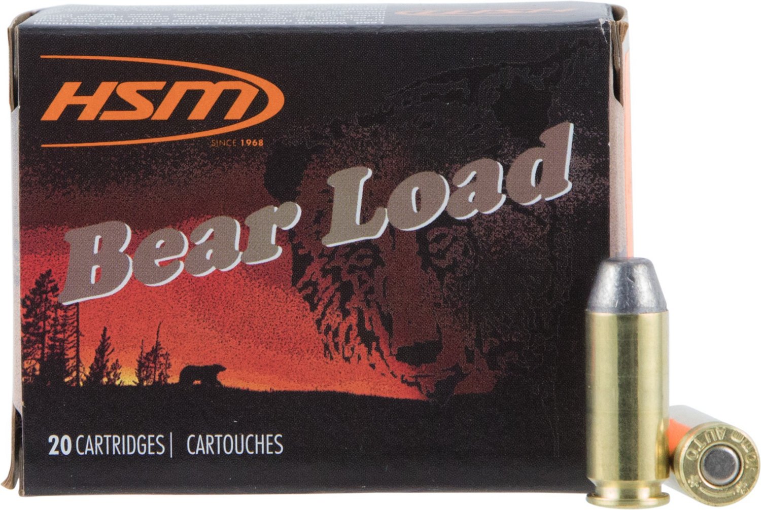 The HSM Bear Load 10mm Auto 200-Grain Round Nose Flat Point Ammunition has a round nose flat point. The ammunition has a 10mm auto caliber and 200-grain weight. 20-round box. Made in USA.