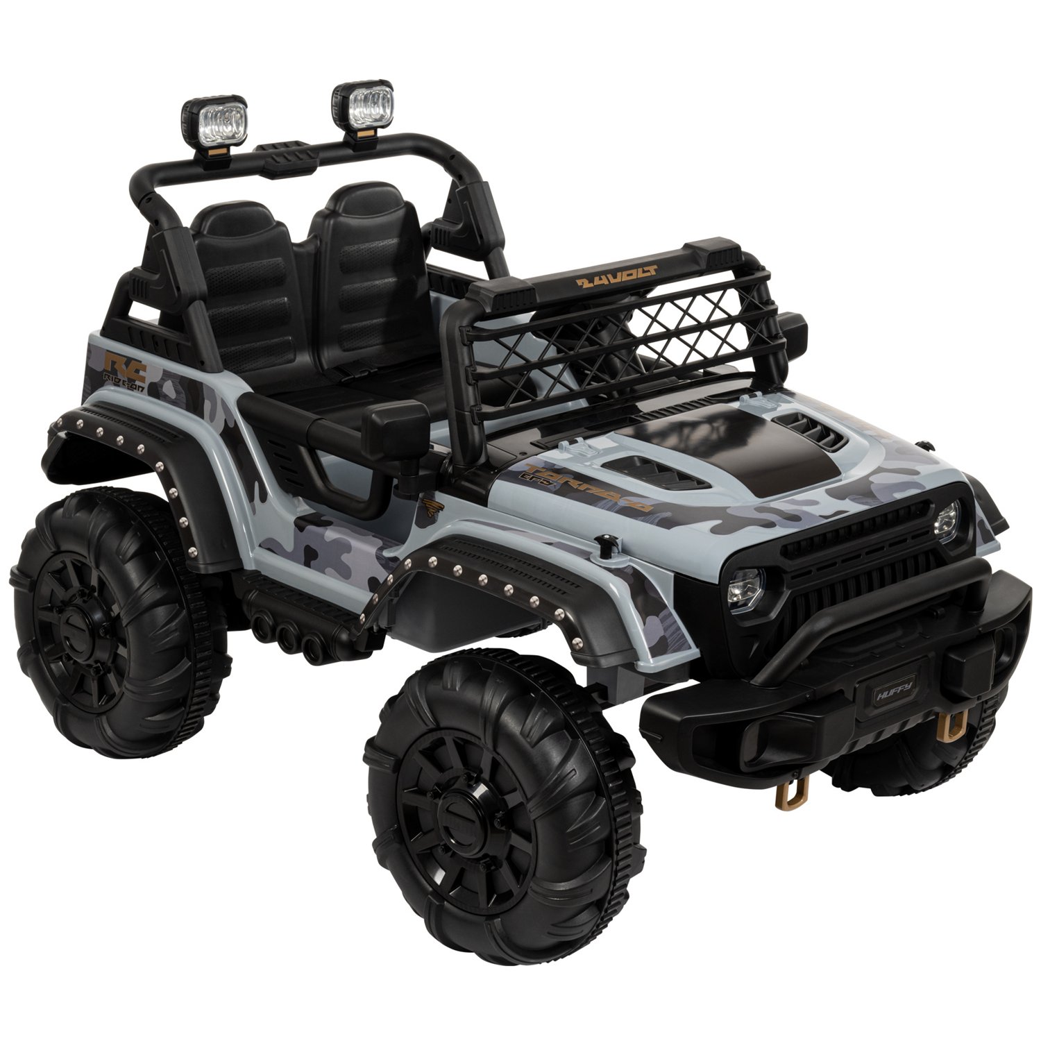 The Huffy 24 Volt Torn8-O Battery Ride On with Remote Control featurs working headlights and motor sounds, working doors, two seats and two speeds: 2.5mph & 5mph. For ages 3-7 year and a max weight of 125 lbs.