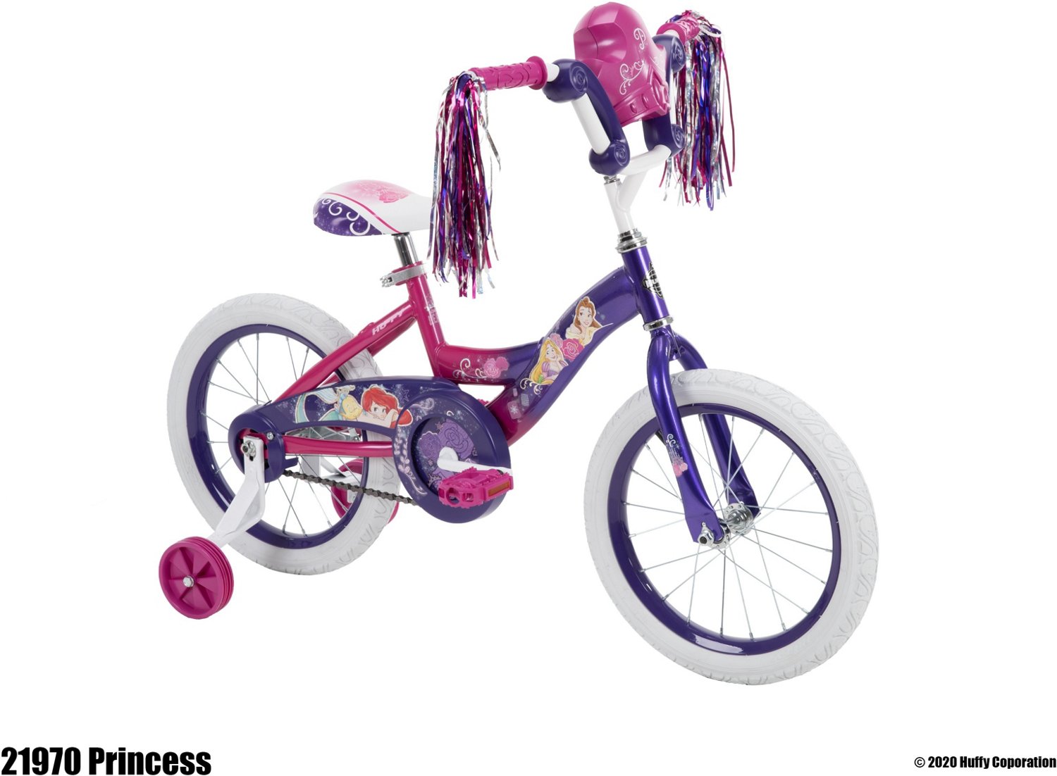 Explore your world on the Huffy Girls' Disney Princess 16 in Bike, and discover what it's like to be a Disney™ Princess. The streamers will shimmer in the sun as you use the heart-shape pedals to move along the sidewalk. On the handlebars, the fashion doll carriage holds up to 2 dolls for even more fun.