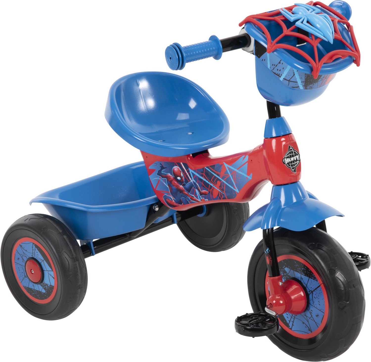 Kids can pedal along with their favorite superhero on a Huffy Spider-Man Tricycle. The durable steel frame is built with a wide wheelbase for stability and adjustable handlebars to grow with your child. Two storage bins let kids take their treasures with them, while colorful Spider-Man graphics make them feel like a superhero.