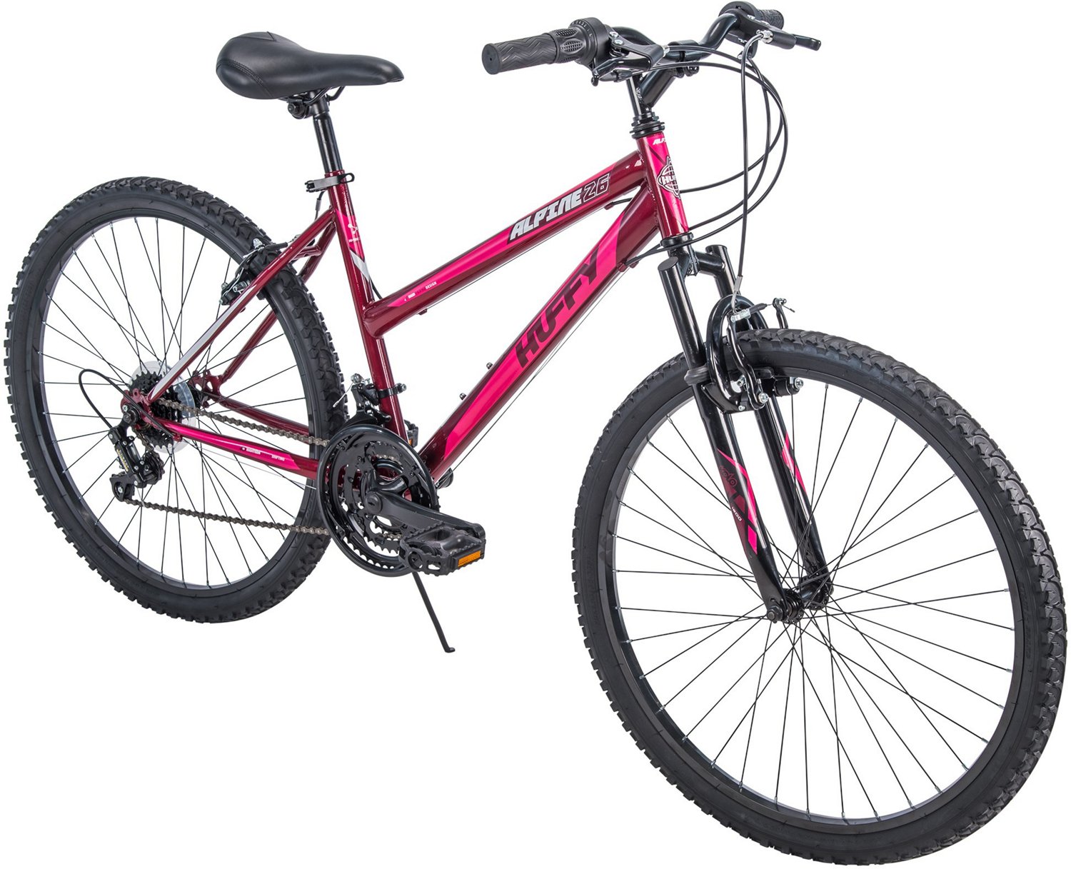 No matter how rough the path gets, you can rely on the Huffy Women's Alpine 26 in 18-Speed Mountain Bike. In addition to its rugged 26-inch wheels, it also features a durable steel frame and 18 gears. And thanks to the responsive Kolo 1200 suspension fork crown, you'll be able to power along with comfort and confidence.
