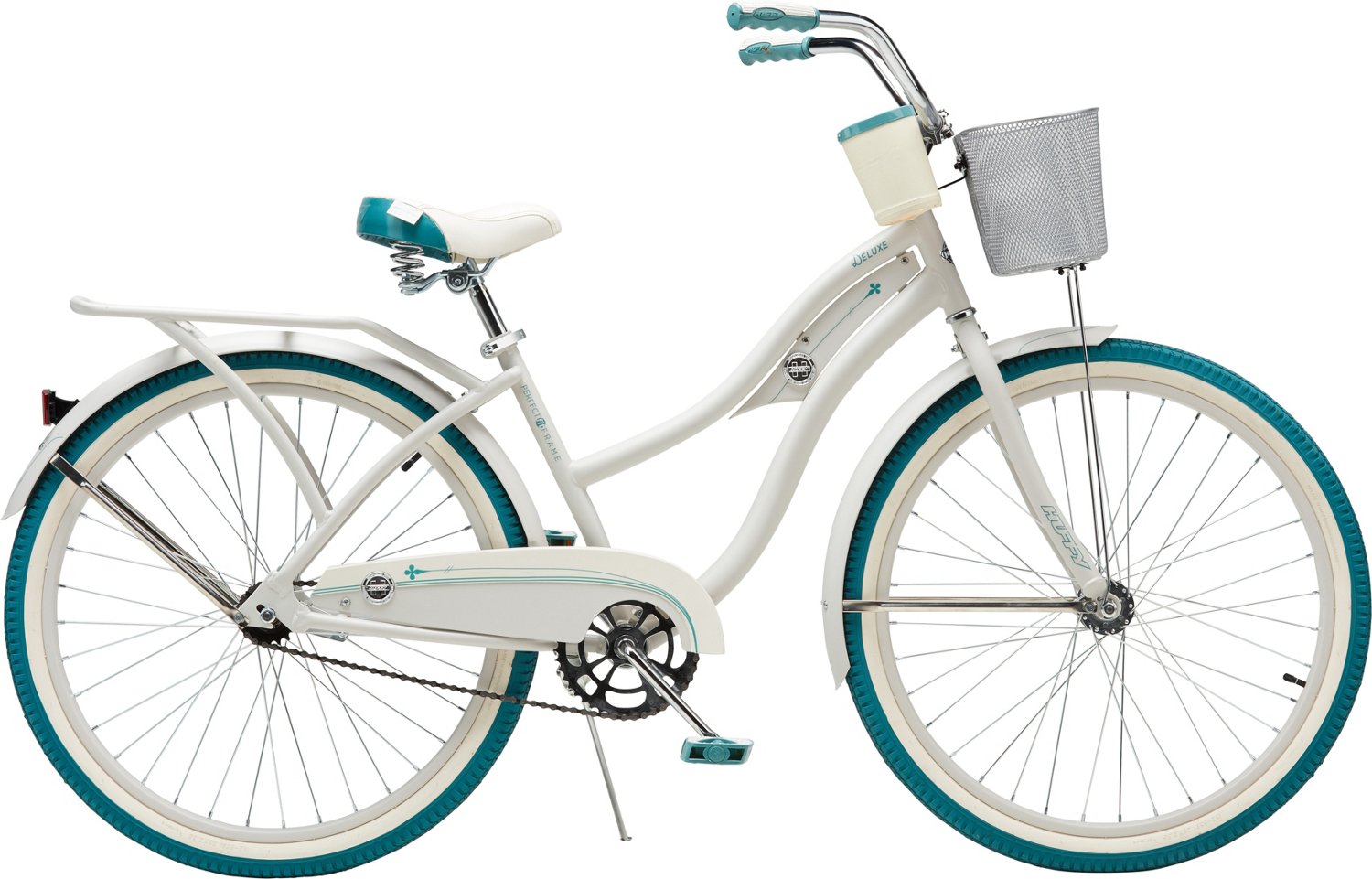 Make your daily commute more exciting with the Huffy Women's Deluxe 26 in Cruiser Bike. The durable Perfect Fit steel frame comes with a rear rack and a front basket to carry your essentials, while the 26-inch x 2.35-inch tires and steel rims supply a smooth ride. The cruiser-style handlebars and padded spring saddle seat add comfort along the journey.