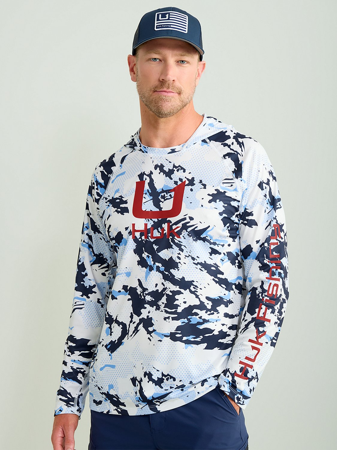 Look your best in the Huk Men's KC Print Icon Performance Hoodie. It is made of 100% polyester. The UPF 50+ rating protects against the sun, and its anti-microbial construction fights odor. The full back panel wicking mesh elevates breathability.