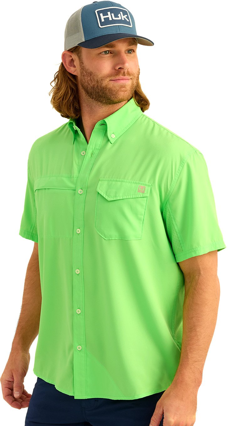 Features and Benefits 100% polyester material provides comfort Button down closure Short sleeves Collar Graphic design for style Specifications Compression: No Clothing Type: Casual Shirts Neckline: Collar Sleeve length: Short Sleeve Activity: Fishing Material: Polyester Heat Retention: No Gender: Men's Size Range: Men's Moisture Wicking: No Care: Machine wash Product Type: Shirts Flame Resistant: No Age Group: Adults' Style: Button Up Shirts Hood: No Placket: Button What's in the Box Huk Men's Tide Point Button Down Shirt