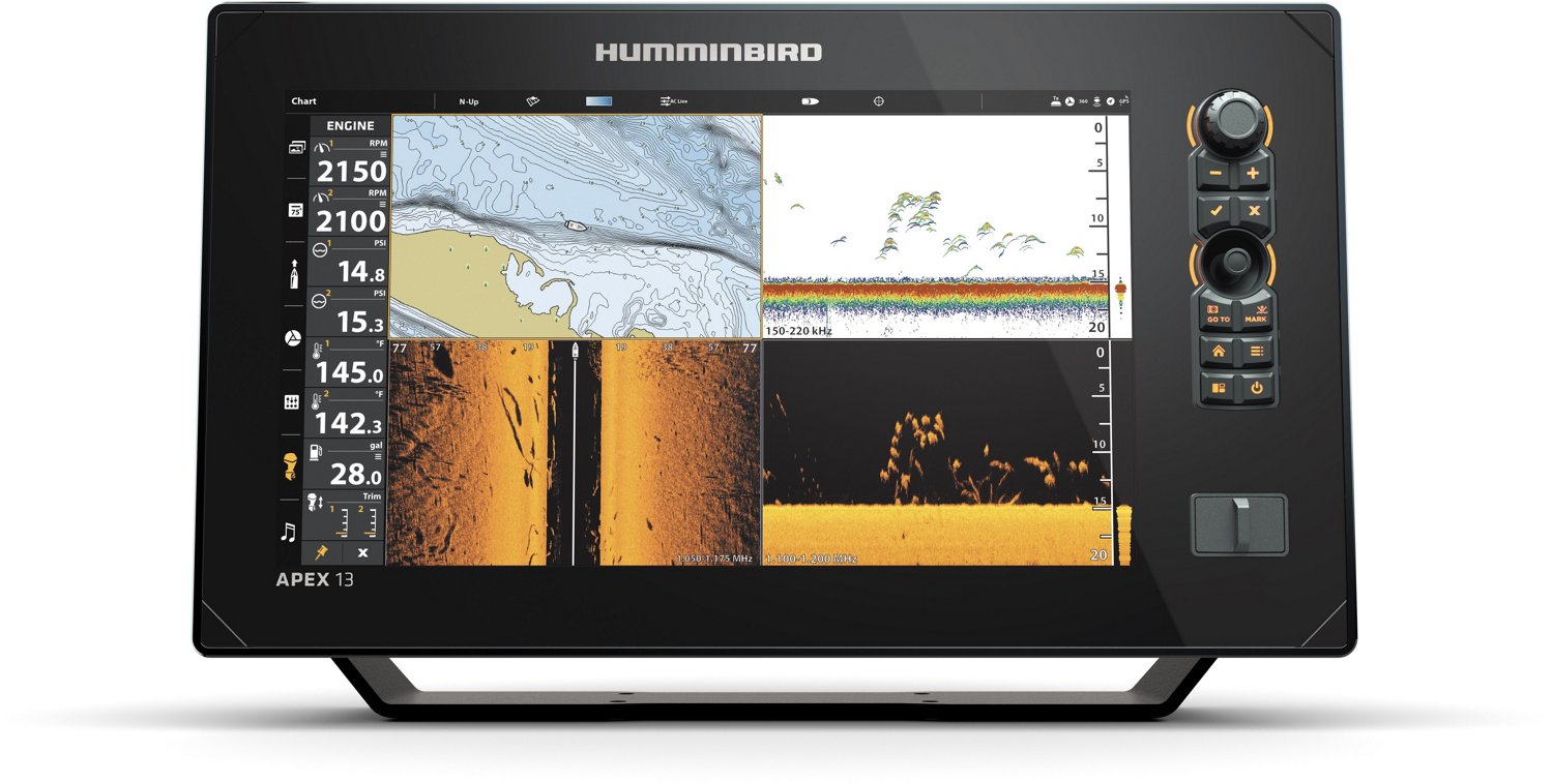 Explore the deep blue with the Humminbird Apex 13 MSI+ Chartplotter. The MEGA imaging+ provides a 250-foot range of view on all sides of the boat, and the Wireless Cannon® Optimum™ downrigger control allows you to reach greater depths. The Minn Kota® ensures stable boat control, and the HD touchscreen display with Cross Touch® interface helps you view and discover every detail.