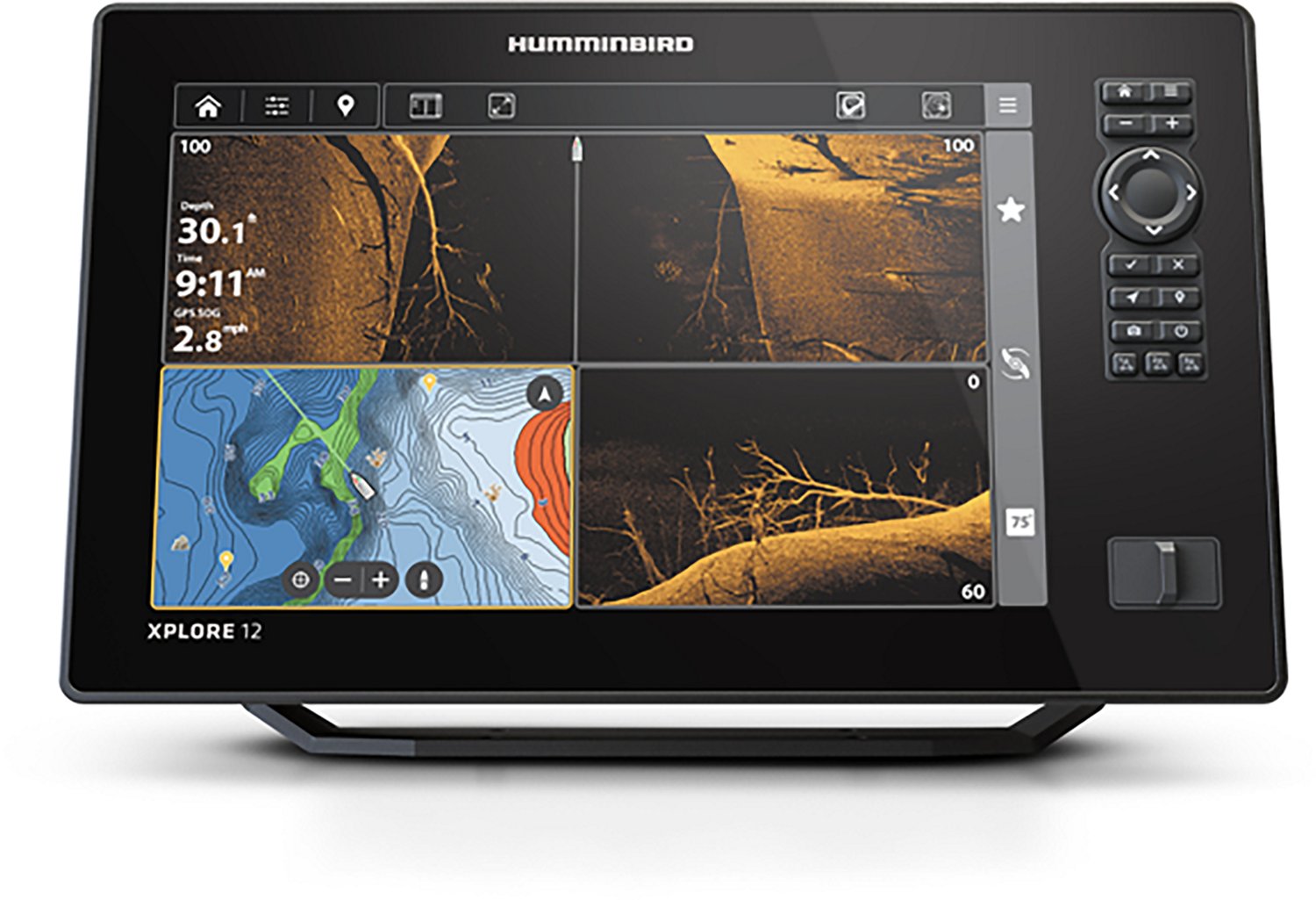Enhance your fish finding with the Humminbird XPLORE 12 CMSI+ Fish Finder. The 12.1 inch full HD display with Cross Touch interface enables clear imaging and easy navigation, while the internal GPS and Humminbird Basemap provide a clear view of underwater terrain and surrounding points of interest. MEGA Side Imaging+ displays viewing out to 200 feet on either side of your boat, and MEGA Down Imaging+ displays viewing out to 200 feet below your boat.