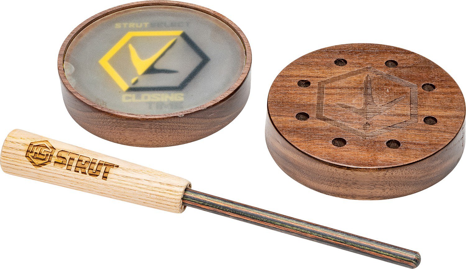 Produce convincing turkey calls with the Hunter's Specialties Strut Select Closing Time Glass Pan Turkey Call. The American walnut and CNC-machined construction affords durability, while the frosted, high-pitched glass surface, Dynalux/Ash striker and pre-tuned soundboard create enhanced sounds.