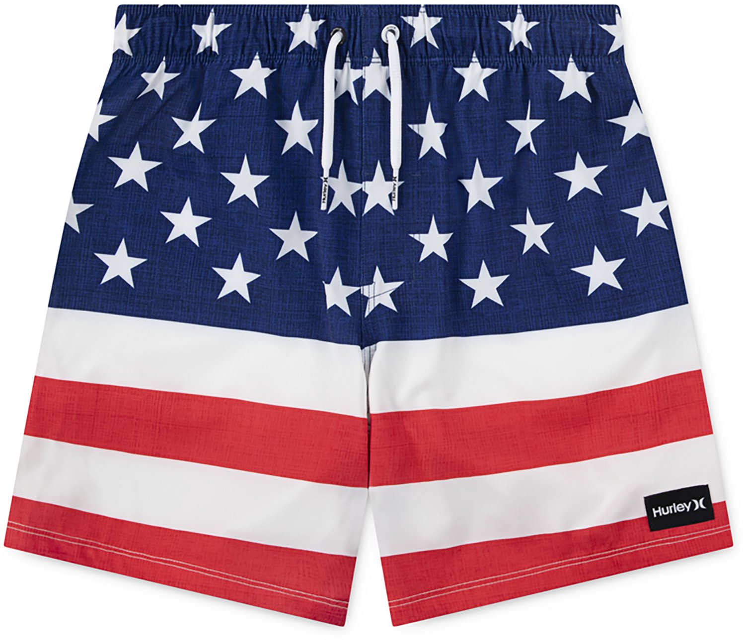 Allover Americana flag-inspired print and a small Hurley logo patch at the hem for style