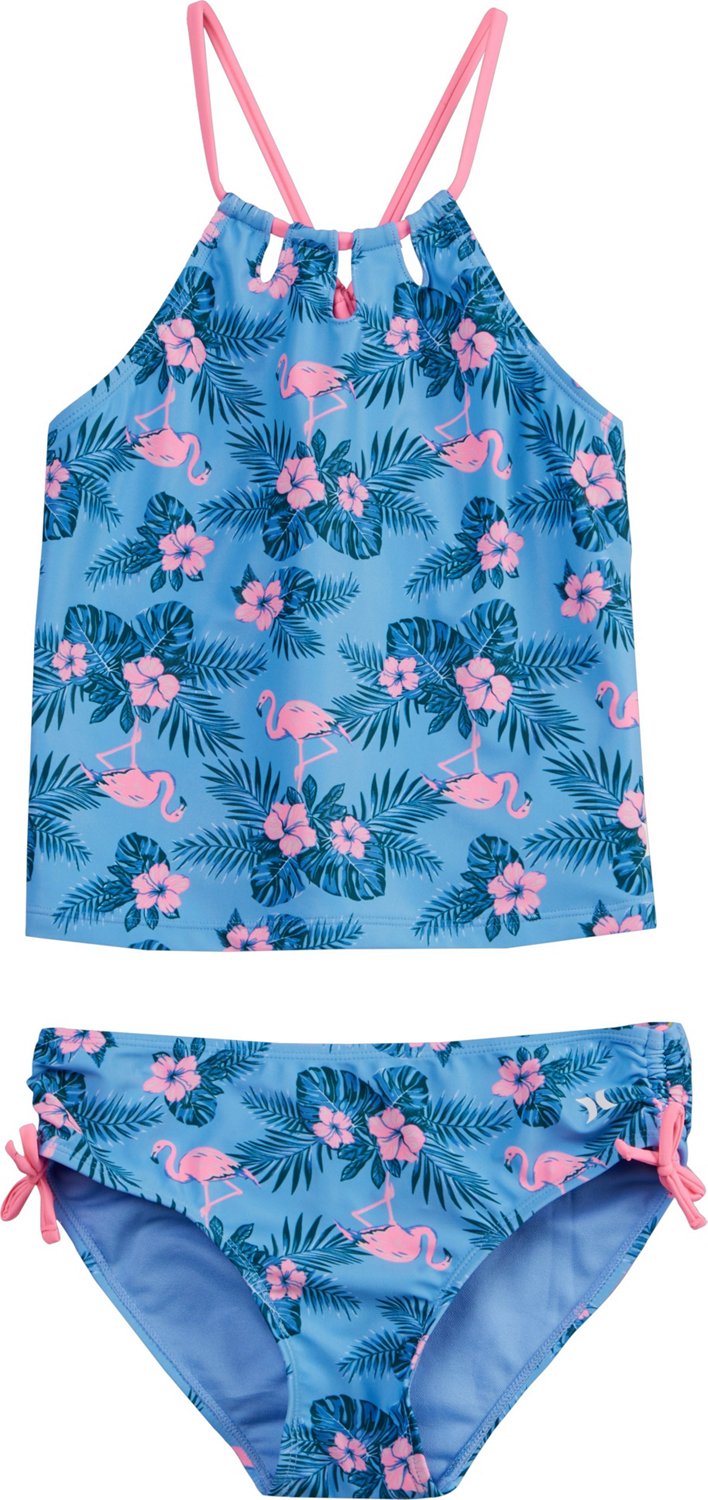 Get ready for fun under the sun with the Hurley Girls' Tri-Cutout Tankini. The tricot fabric delivers UPF 50+ protection and feels soft for comfort. The strappy halter neckline and all-over flamingo print add pool- or beach-ready style.