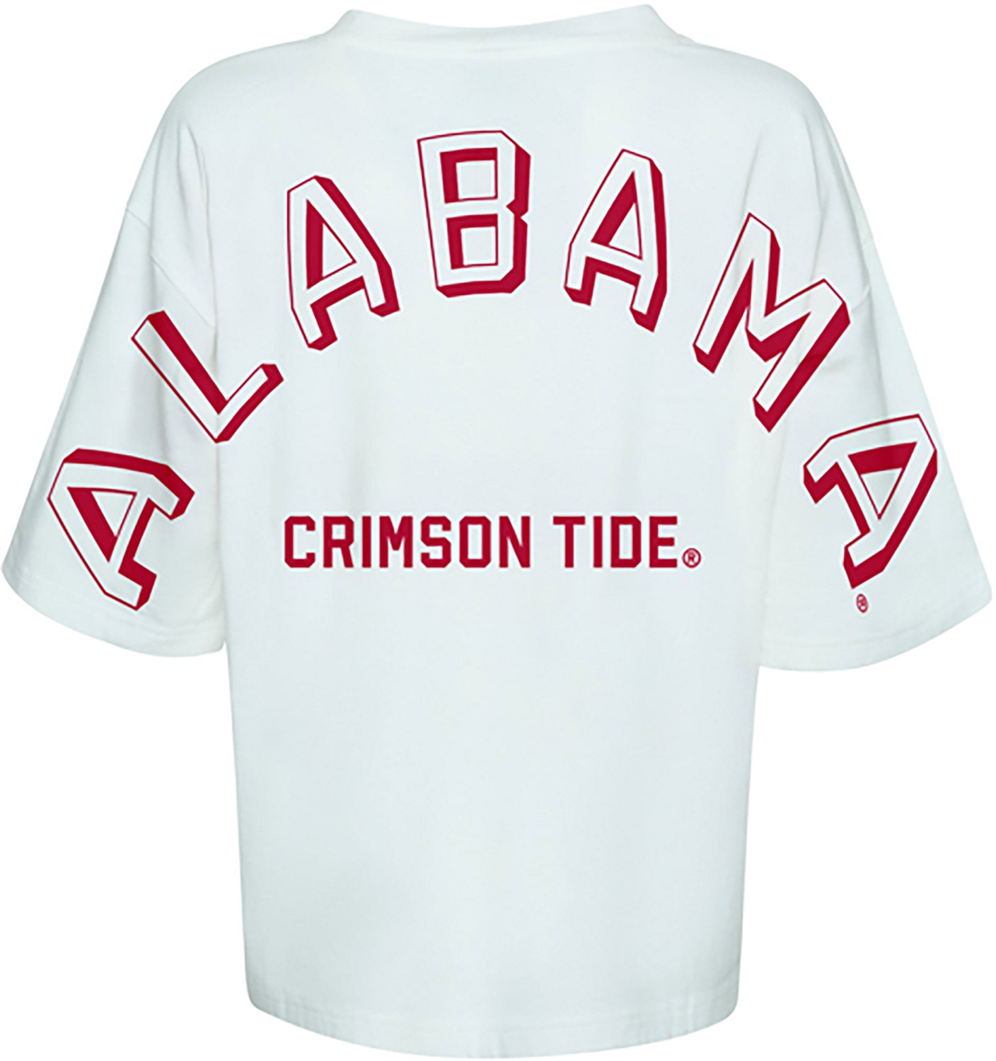 Root for your favorite team when you wear the Hype and Vice Women's Alabama Crimson Tide Football Oversized Short Sleeve T-shirt. It is made of 100% cotton. The short sleeves keep you cool, and its V-neckline offers a sporty look. The screen printed Alabama Crimson Tide graphics on the front and across the back shoulders shows off your team spirit.