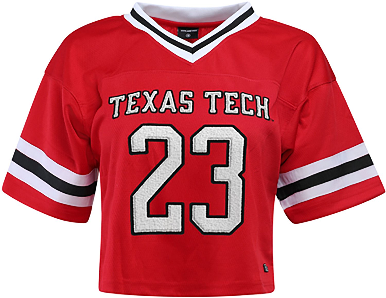 Root for your favorite team when you wear the Hype and Vice Women's Texas Tech Red Raiders Cropped Football Jersey. It is made of 100% polyester. The V-neckline creates an authentic jersey look, and its embroidered twill graphics of the Texas Tech Red Raiders show off your team spirit. The boxy, cropped fit creates a fun silhouette.
