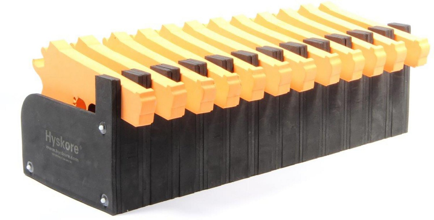 Keep your pistols organized in the Hyskore 12 Gun Modular Hand Gun Storage Rack. The closed cell foam provides rigid structure and a soft surface feel. It also resists oil and water for added longevity. The slots accommodate single or double stack magazine handguns, and can be cut to fid wider guns.
