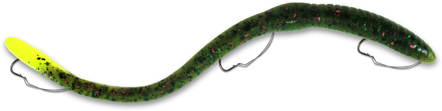 Draw bass to your line with the IKE-CON Big 8ight Weedless 8 in Worm Baits 2-Pack. The realistic appearance mimics the movements of a live worm, and the baits skip under and around vegetation with ease. They can be fished with a weed line or with Carolina rigging and work well with a slow retrieve. Made in USA.