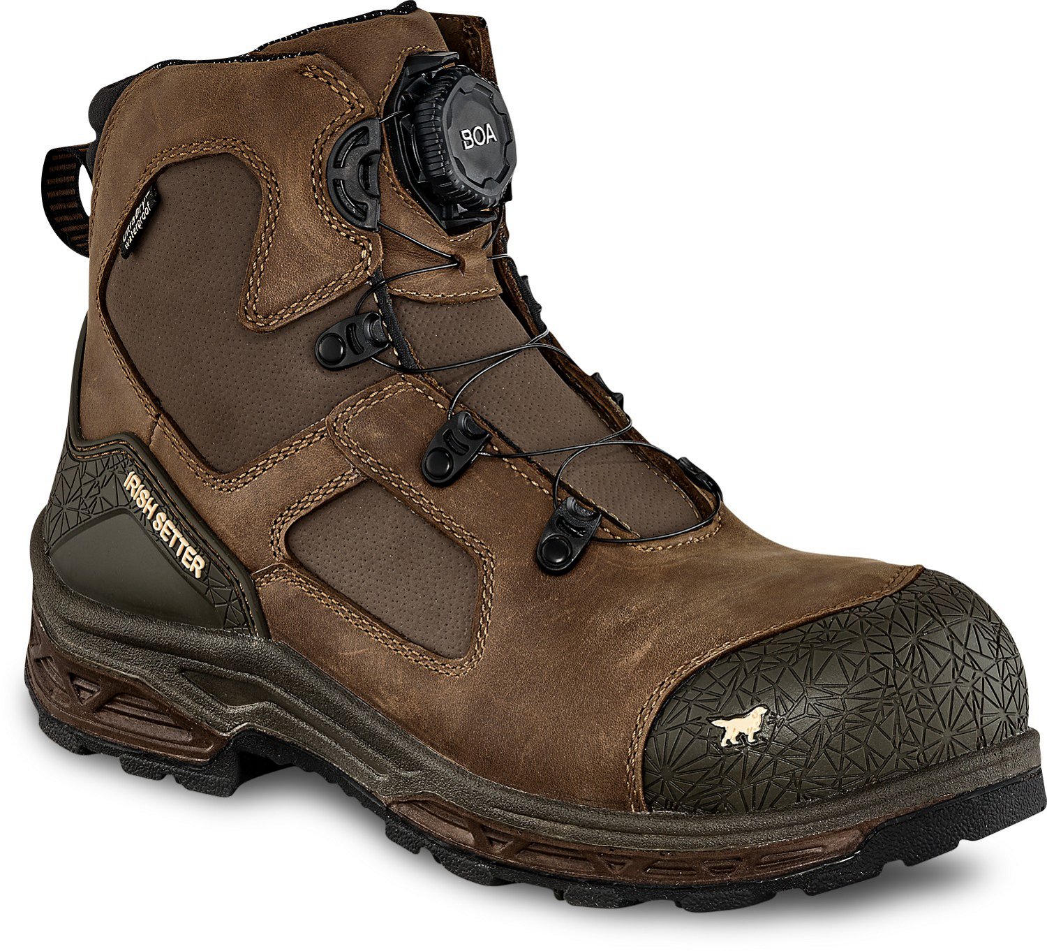 Take on the workday with comfort underfoot in the Irish Setter Men's Kasota BOA Nano Composite 6 in Work Boots. The leather uppers offer durability and the UltraDry moisture management linings help keep your feet dry and comfortable on the jobsite. The nonmetallic nano safety toes provide protection, while the slip and heat resistant outsoles supply reliable traction. Electrical Hazard (EH) rated.