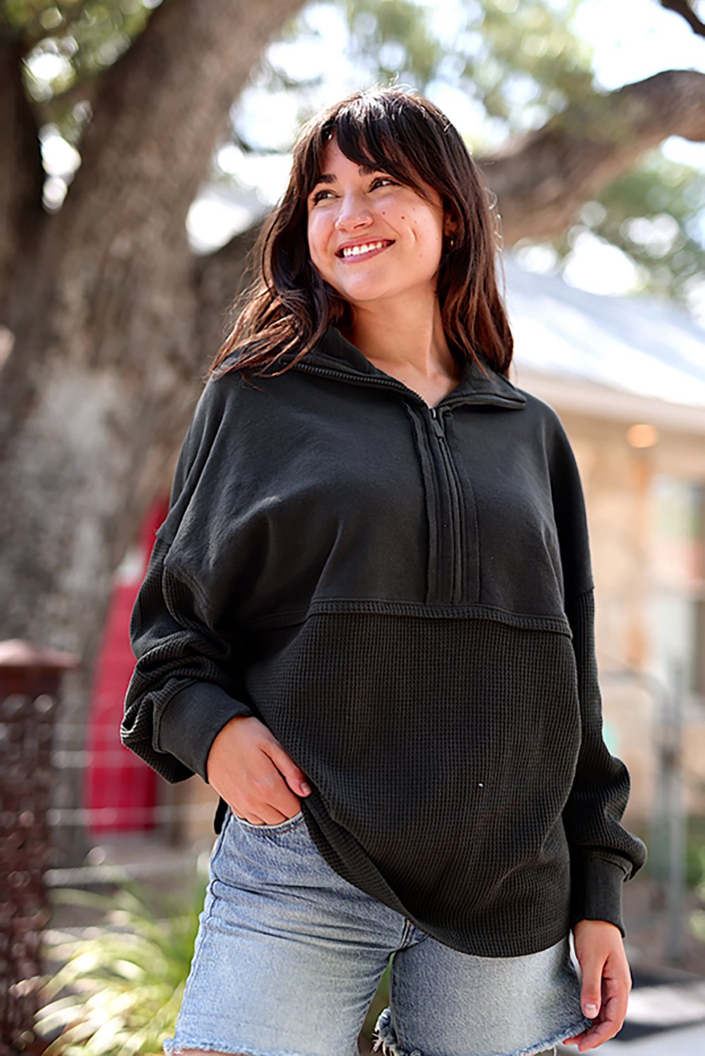 Look your best when you wear the Jadelynn Brooke Women's Ready Or Not Waffle 1/4-Zip Pullover Sweatshirt. It is made of 80% cotton and 20% polyester. The 1/4-zip closure allows you to adjust the neckline to your liking, and its scoop front and back hems create a flattering silhouette. The waffle pattern on the sleeves and bottom half of the body provide eye-catching details.