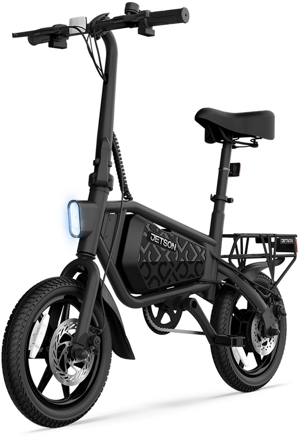 Cruise around town on the Jetson Bolt Pro Max 14 in Electric Bike. This steel alloy bike has a 350-watt motor and a 36-volt battery for a top cruising speed of 15.5 miles per hour and a top range of 25 miles. The dual-disc brakes help you stop quickly, while the 14-inch wheels help you tackle difficult terrain. Choose from throttle, electric pedal assistance or cruise control to customize your ride.
