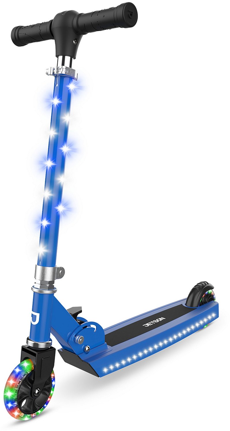 Light up the road with the Jetson Jupiter Kick Scooter. This classic kick scooter features an easy-to-reach rear fender brake and adjustable handlebars so you can keep playing as you grow. Over 100 LEDs on the stem, deck, and wheels can be powered on or off, letting you light up your way to nonstop fun.