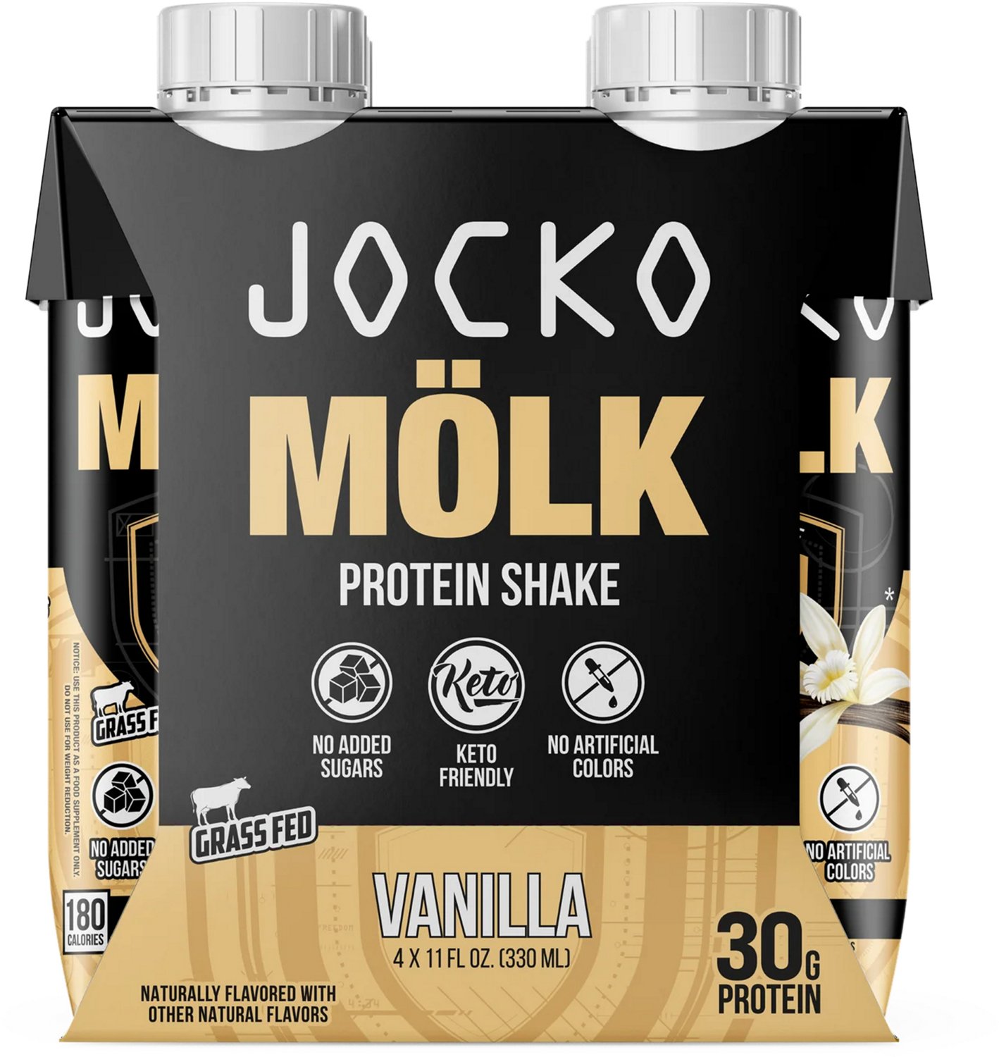 Repair muscle, build strength and fuel your body with Jocko Molk RTD Protein Shake 4-Pack. This shake is ready to drink without measuring or mixing. It features 30 grams of grass-fed protein and no added sugar.