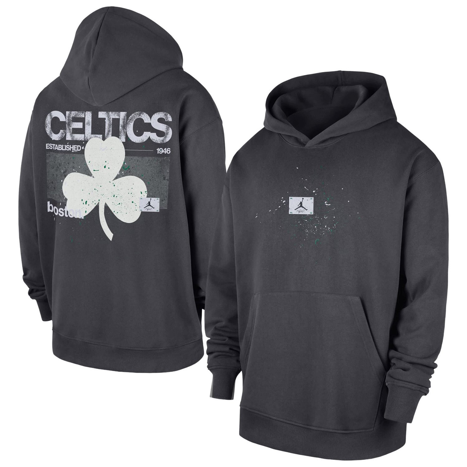 From pounding the pavement to cheering in the arena this Boston Celtics Statement Jumpman Flight Premiere Hoodie by Jordan Brand is the perfect midweight layer for year-round wear The semi-brushed fleece fabric with a smooth exterior and slightly fuzzy interior provides a cozy breezy feel that keeps you comfy during in-between temps Distressed team details add vintage flair to this essential Boston Celtics hoodie