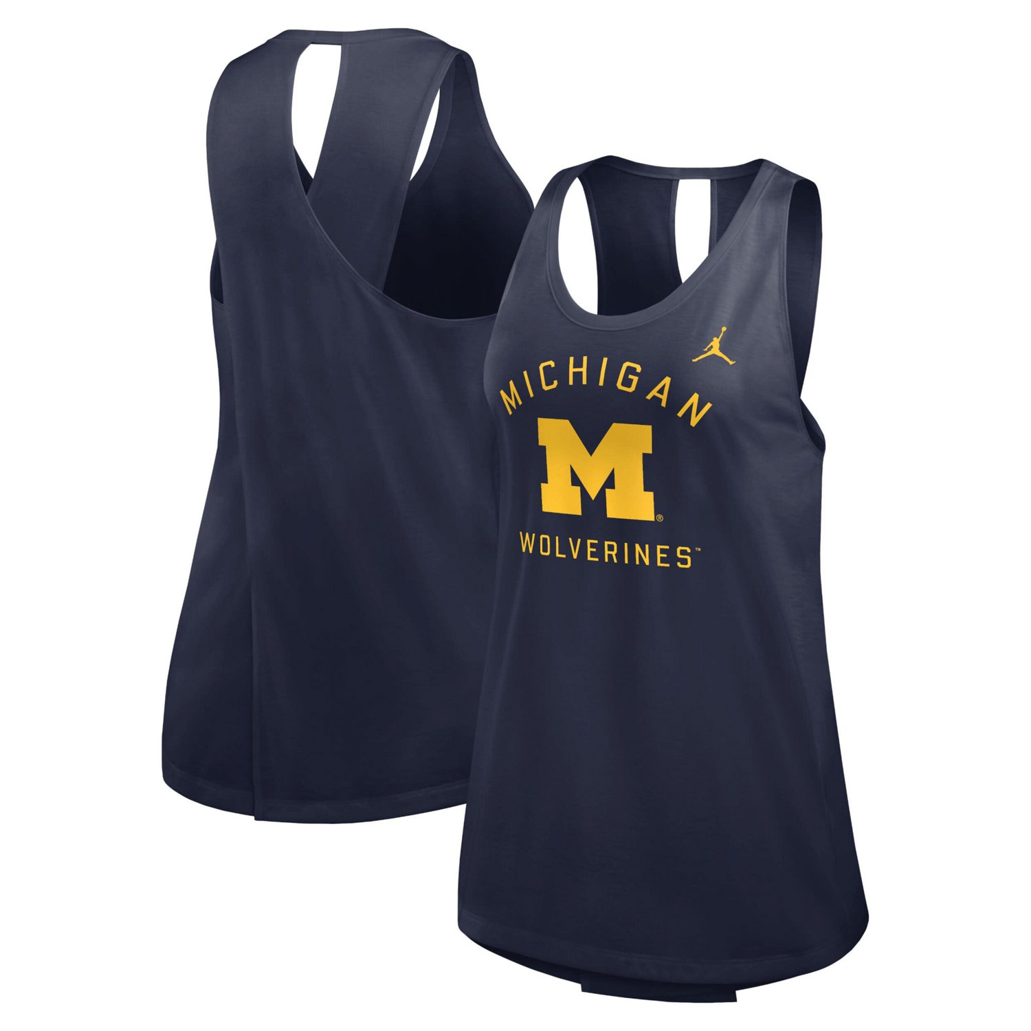 Rep your Michigan Wolverines in this Jordan Brand Primetime Open Back Tank Top showcasing a vibrant and sporty design Its crossed back creates a breezy feel and fashionable look perfect for game day or casual outings The scoop neck provides a relaxed fit while the team name and logo screen printed across the front proudly displays your devotion for the Michigan Wolverines