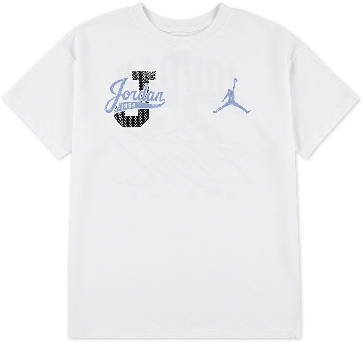 The Jordan Girls' Distressed Collegiate Short Sleeve T-shirt offers a modern, stylish look with its bold distressed graphics and collegiate-inspired design. Crafted from soft, breathable fabric, this tee ensures all-day comfort while making a statement with its iconic Jordan branding and vintage appeal. Perfect for casual outings or athletic activities, it pairs effortlessly with any outfit for a sporty yet fashionable vibe.