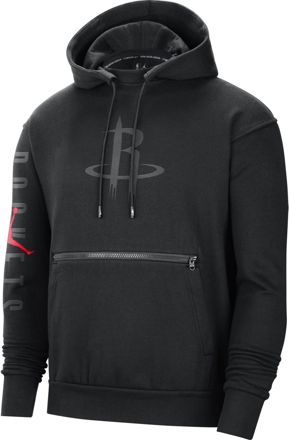 Stay comfy as you boast your fan pride in the Jordan Men's Houston Rockets CTS Statement Pullover Hoodie. The cotton and polyester single-knit fleece fabric with brushed insides provides ultrasoft, cozy wear and the lined hood with drawstrings supplies comfortable, custom coverage from the elements, while the Rockets-themed graphic designs proudly put your fandom on display.