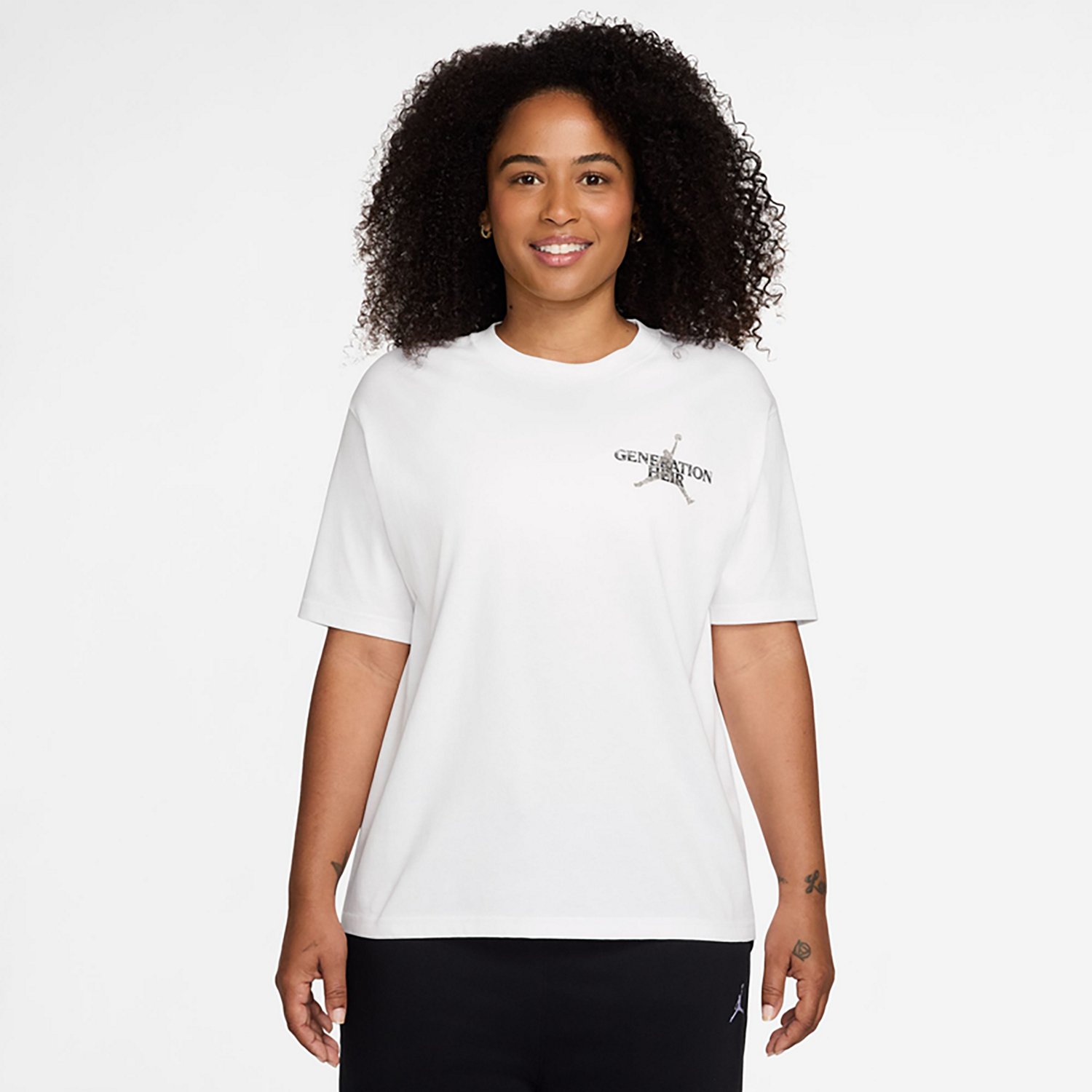 Show off your competitive spirit with the Jordan Women's Sports Dri-FIT Graphic T-shirt. The cotton material provides a comfortable feel, while the Dri-FIT technology helps keep you cool and dry. The graphic design offers a stylish look.