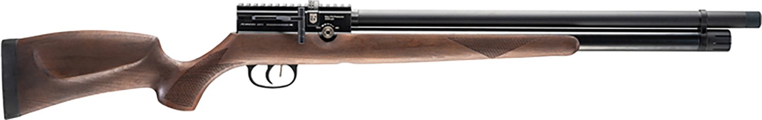 The JTS Airacuda Standard .22 Air Rifle boasts side lever action and has a 10-round capacity. It's built with a shrouded barrel, wood stock and an adjustable 2-stage trigger. A 2-pound trigger pull, manual safety and picatinny rail complete the design.