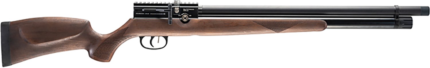 The JTS Airacuda Standard .25 Air Rifle boasts side lever action and has a 10-round capacity. It's built with a shrouded barrel, wood stock and an adjustable 2-stage trigger. A 2-pound trigger pull, manual safety and picatinny rail complete the design.