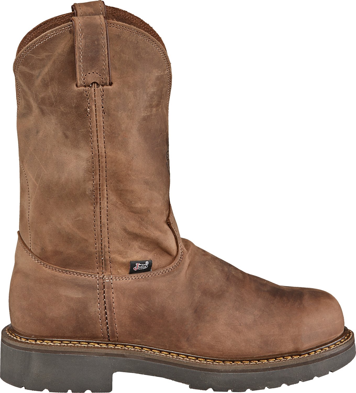 Take on your workday in the Justin Men's Rugged Bay Gaucho EH Steel Toe Wellington Work Boots. Made with rugged, retanned, oil-tanned leather uppers, these work boots feature J-Max® Double Comfort® System insoles with J-Flex® and Justin Jel® removable orthotics that help keep your feet comfortable. EH rated. Made in USA. Pull-on style.