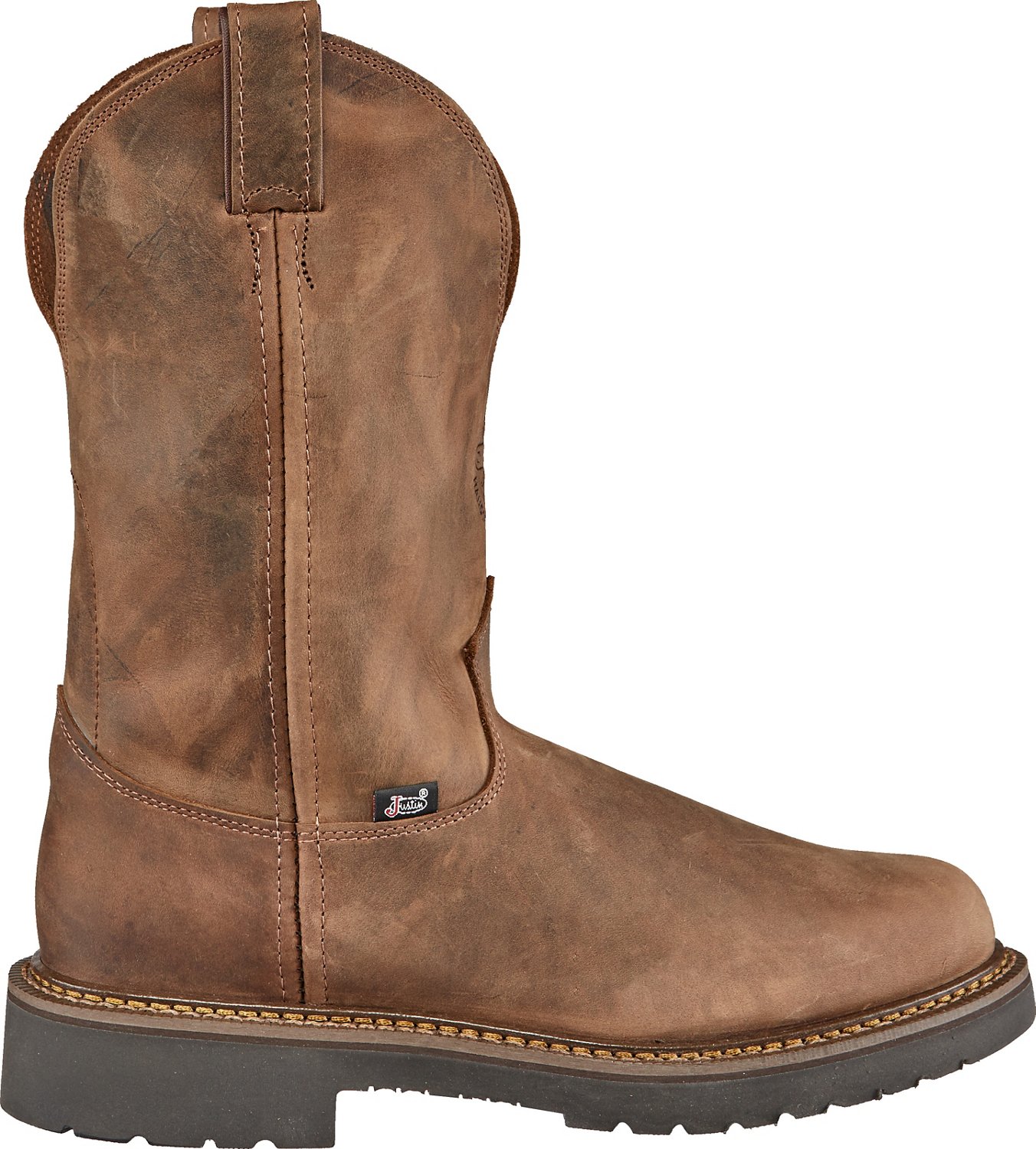 Take on your workday in the Justin Men's Rugged Bay Gaucho EH Wellington Work Boots. Made with rugged retanned, oil-tanned leather uppers, these work boots feature J-Max® Double Comfort® System insoles with J-Flex® and Justin Jel® removable orthotics that help keep your feet comfortable. EH rated. Made in USA. Pull-on Style.