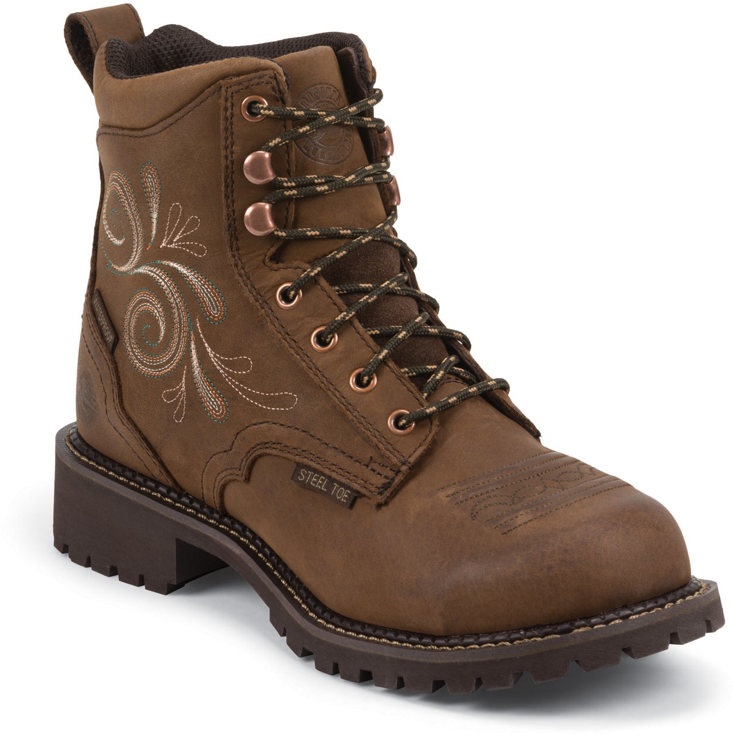 Meet the challenges of each work day with confidence wearing the Justin Women's Katerina Waterproof Steel Toe Lace Up Work Boots. Your feet will feel supported and cushioned atop the J-Flex Flexible Comfort System® insoles, and you'll enjoy sure footing with the lug outsoles providing traction underneath. Thanks to the steel toes and EH-rated design, you'll feel that much safer near potential hazards.