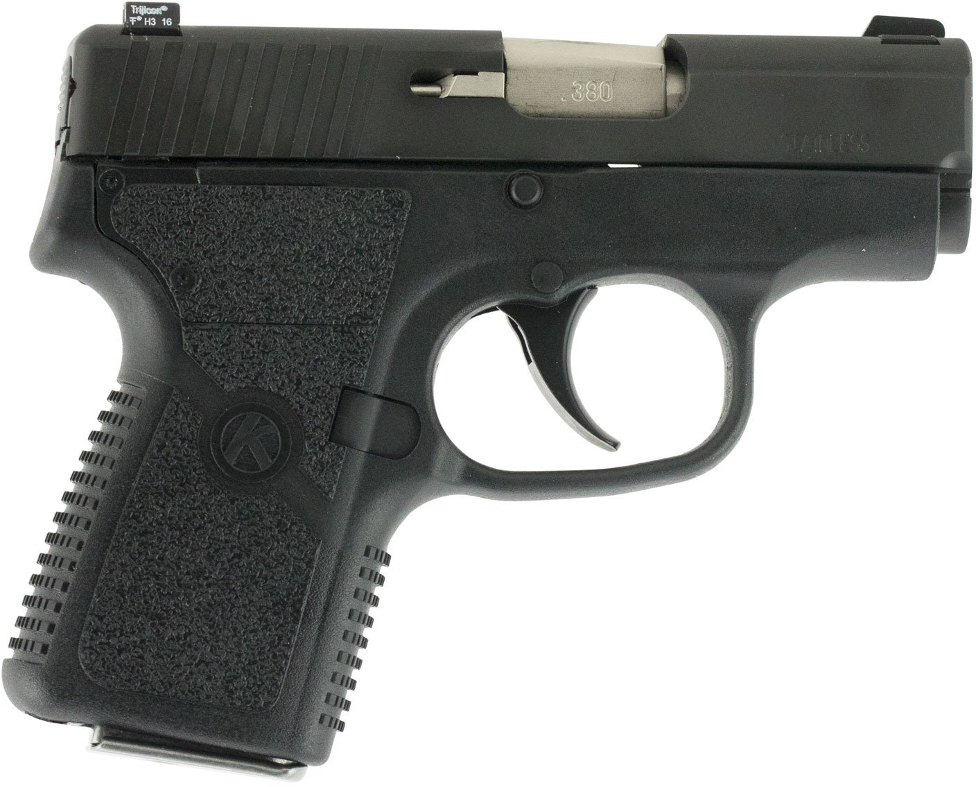 This Kahr P380 .380 ACP Semiautomatic Pistol features a 6+1 capacity and semiautomatic action. The polymer frame boasts a blackened stainless finish and the pistol is equipped with Tritium night sights.