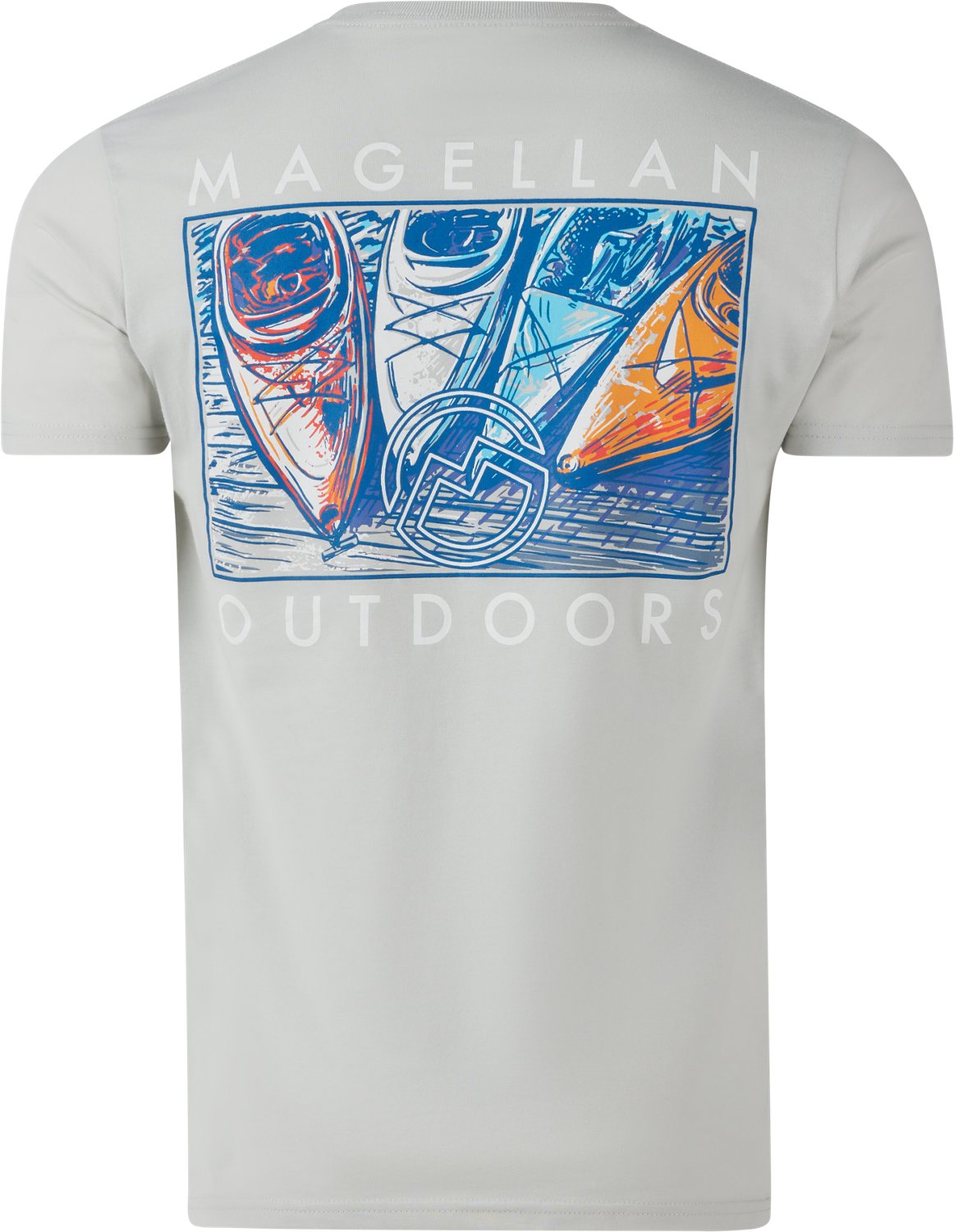 The Magellan Outdoors Men's Kayak Back T-shirt is made of cotton and polyester and features a screen-printed graphic. Short sleeves. Machine wash cold.