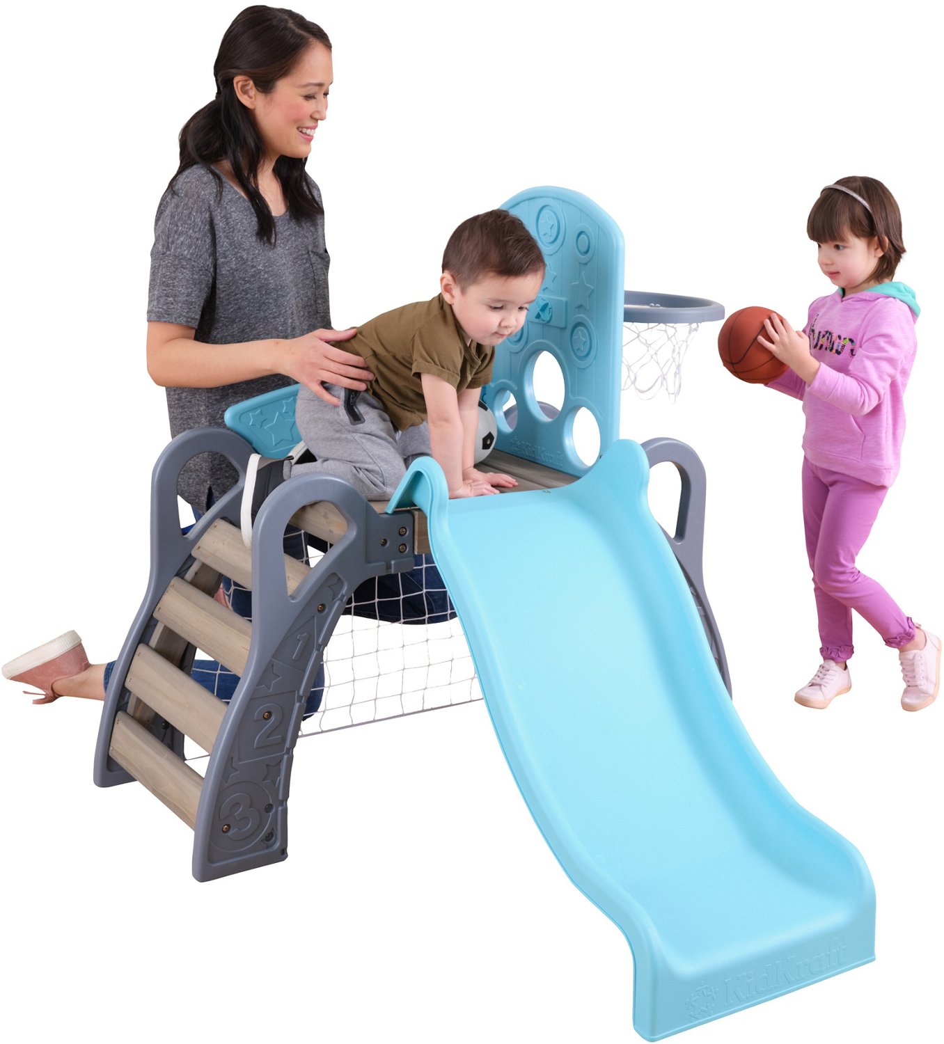 Help your children play actively with the KidKraft 5-in-1 Sports Climber. The plastic and wood construction provides long-lasting durability, and the EZ Kraft Assembly™ provides easy installation. The short slide builds their confidence, while the basketball hoop and soccer net engage them in fun activities.