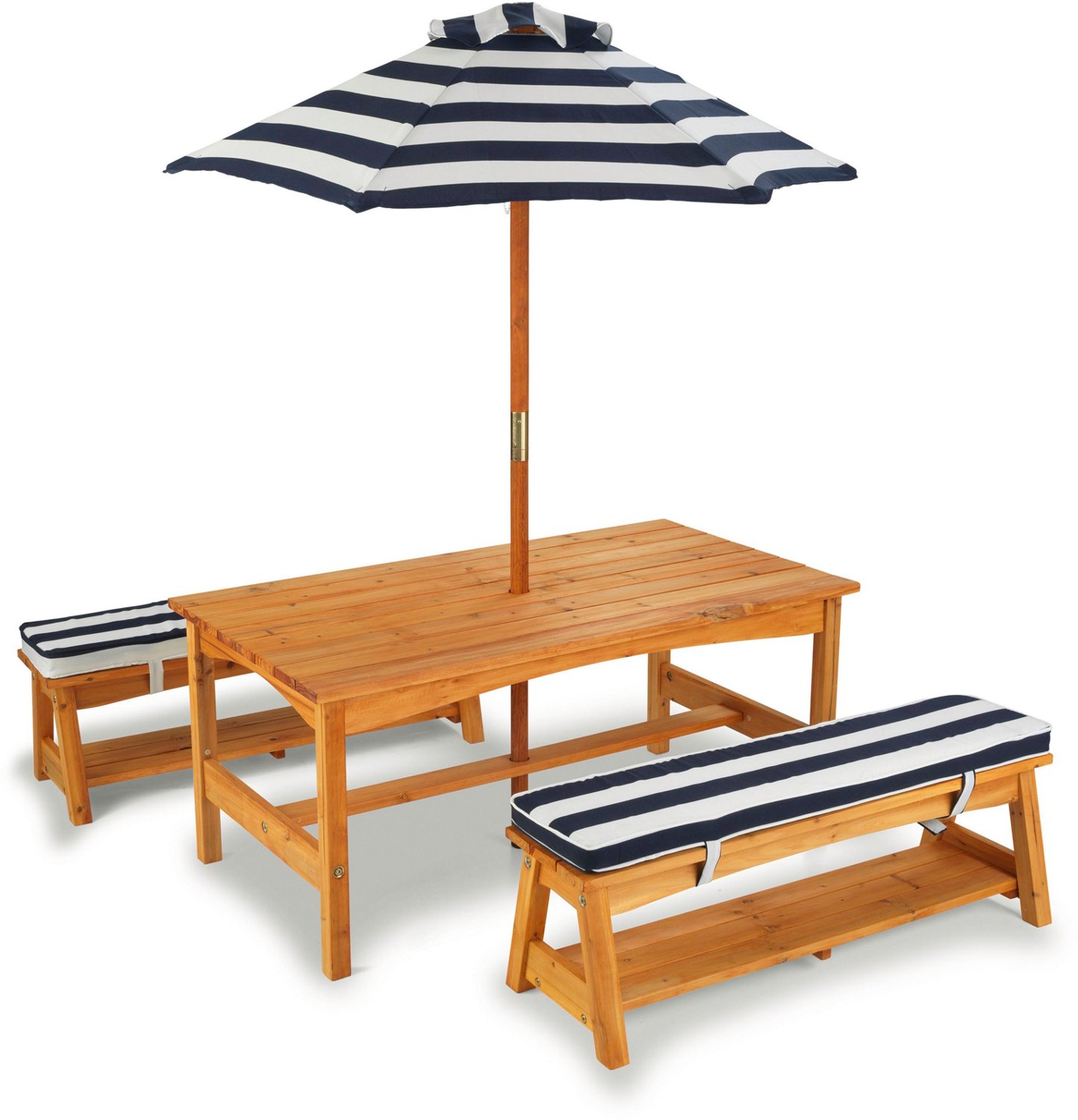 Give your kids a fun way to enjoy the day with the KidKraft Outdoor Table & Bench Set. Constructed from weather-resistant wood, this set is built to withstand the elements, and the adjustable umbrella offers a shady spot to cool down. The cushions provide a comfortable place to sit, while the striped design delivers a unique and stylish look.