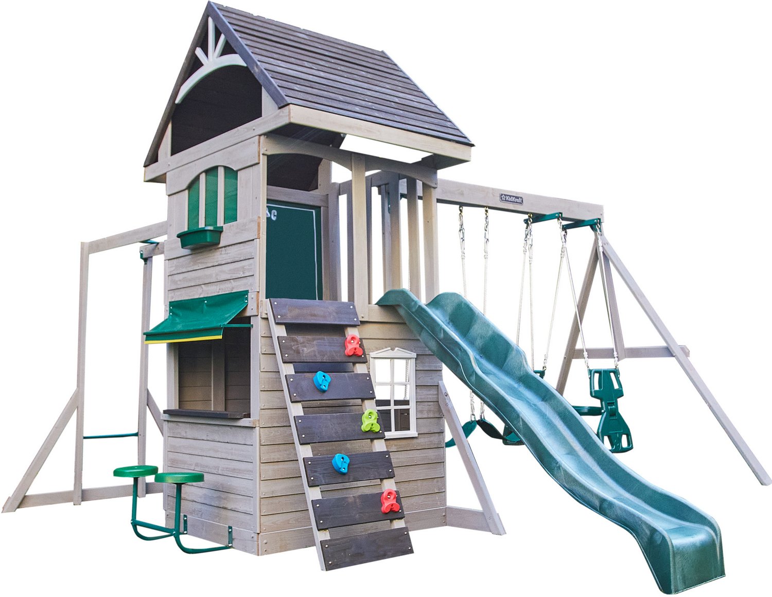 Swing, climb and more with this KidKraft River Canyon Wooden Swing Set/Playset. It features a high-rail wave slide, a rock wall, 2 belt swings, a 2-person glider, a café window with 2 attached stools, an awning, monkey bars and a vinyl chalk wall to offer physical and creative play types, and the playset is made of weather-resistant wood for durability and a classic aesthetic.