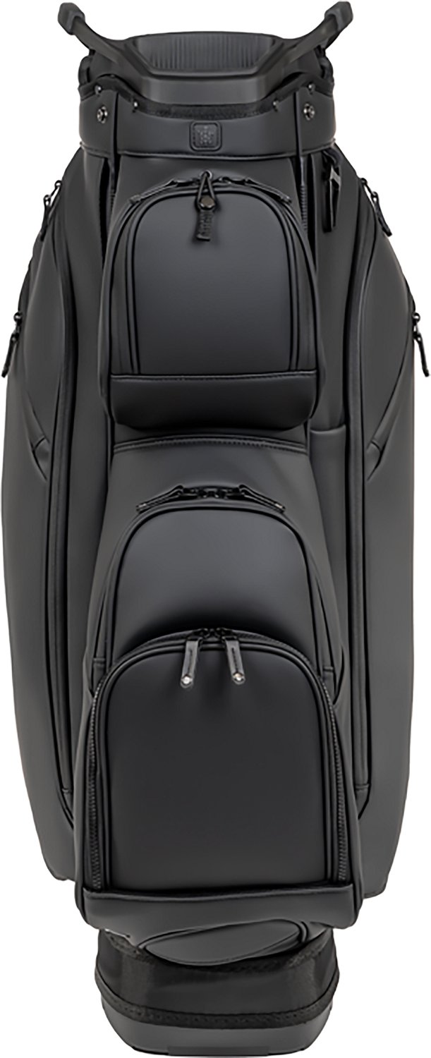 Hit the green with the Kradul Lux Cart Bag. It is constructed of luxury vegan leather, enhancing durability. The 14 individual, full length dividers are equipped with a double sized putter well, and its removable ball pocket flap adds personalization. The over molded, push-cart ready bottom provides maximum stability.