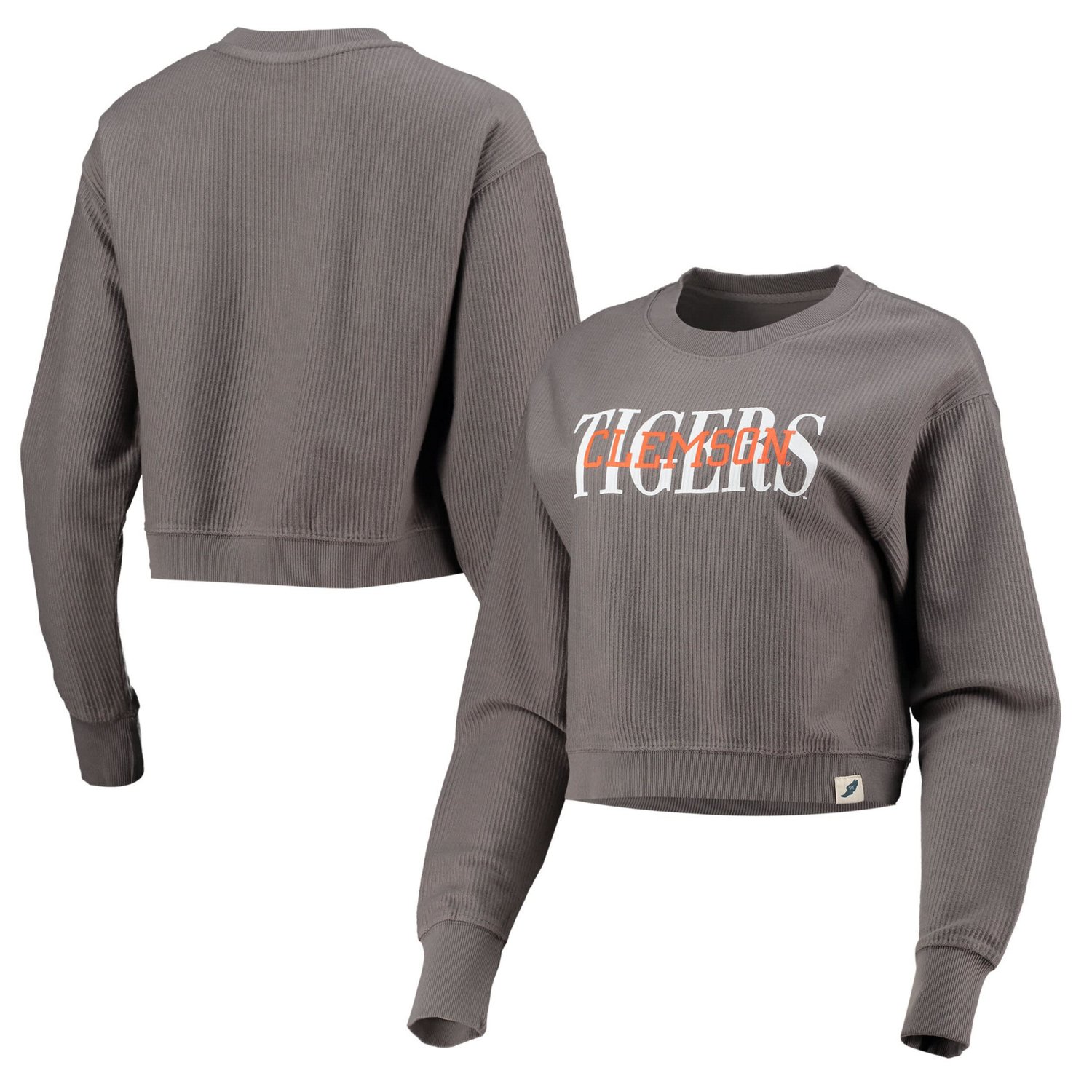The Women's League Collegiate Wear Graphite Clemson Tigers Classic Corded Timber Crop Pullover Sweatshirt is the perfect way to show your support for the Clemson Tigers Made from soft and comfortable cotton this lightweight sweatshirt is perfect for mild temperatures The cropped fit and corduroy fabric give it a stylish look while the woven clip tag with the brand logo adds a touch of authenticity Whether you're cheering on the Tigers at the game or just relaxing at home this sweatshirt is sure to keep you comfortable and stylish