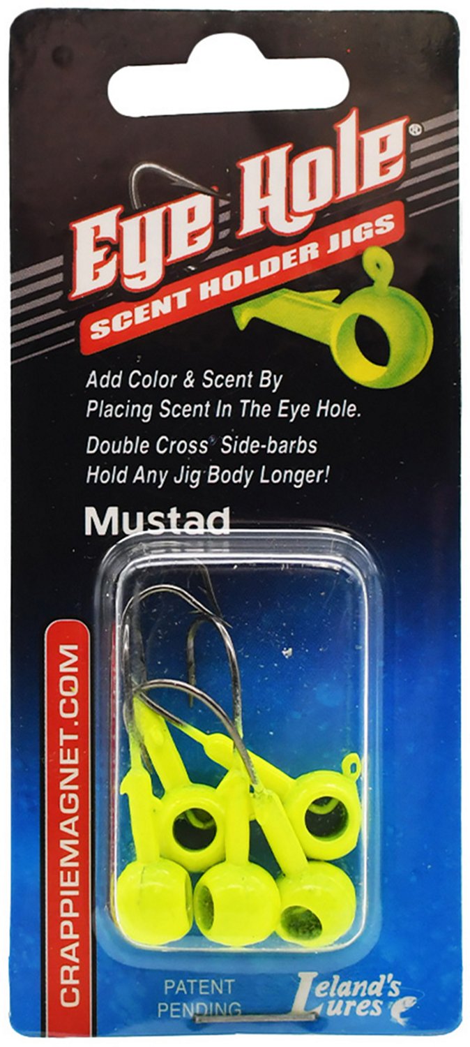 Upgrade your old jigheads to the Leland Lures Eye Hole Round Head 1/16 oz Jigheads 5-Pack. These jigheads have eye holes that can hold scent, urging fish to swim up and see what smells delicious, and the Double Cross Side-barbs are strong enough to make sure your chosen jig remains on the hook as fish take a bite. The Mustad hooks make sure fish stay stuck as they bite down.