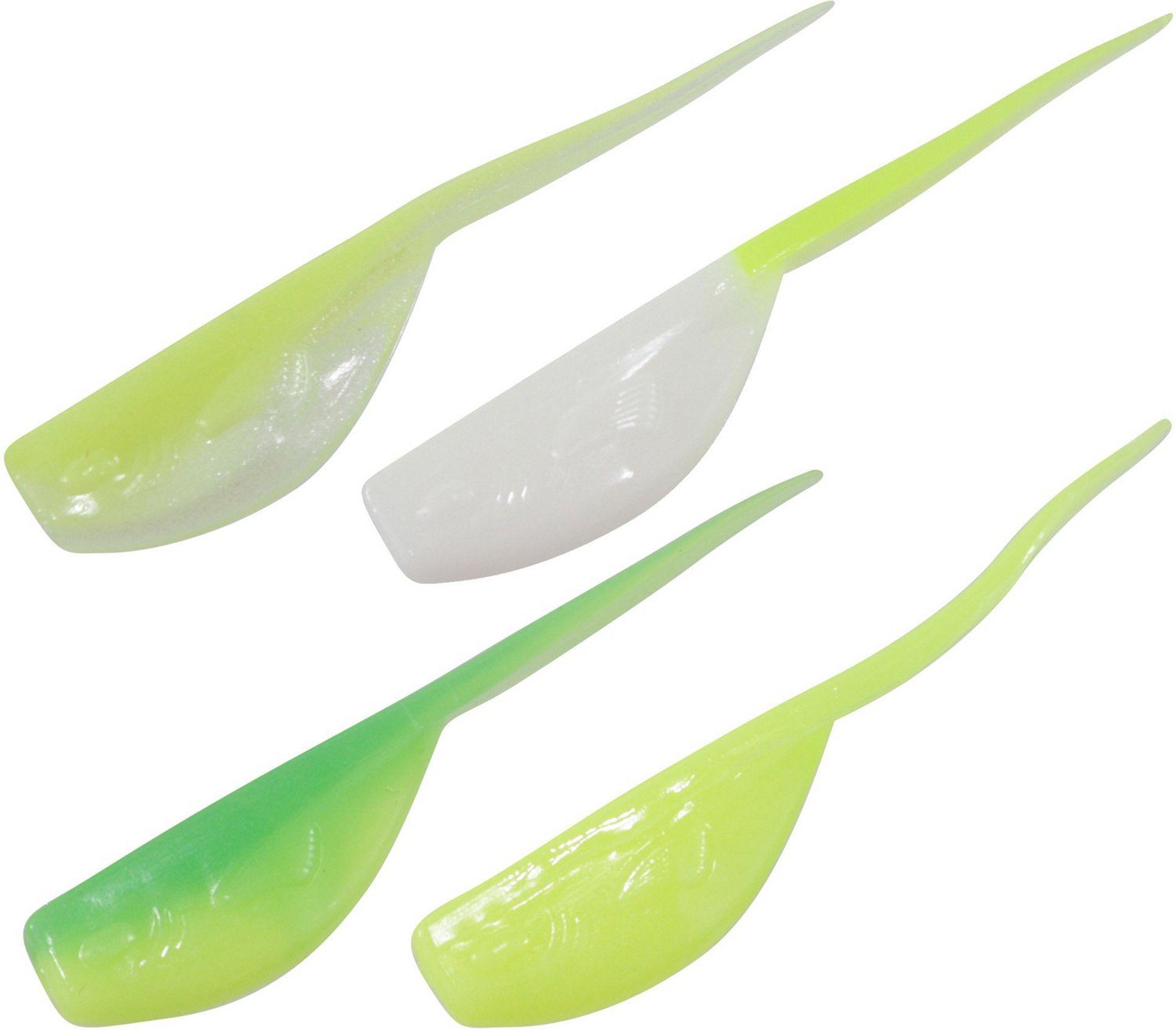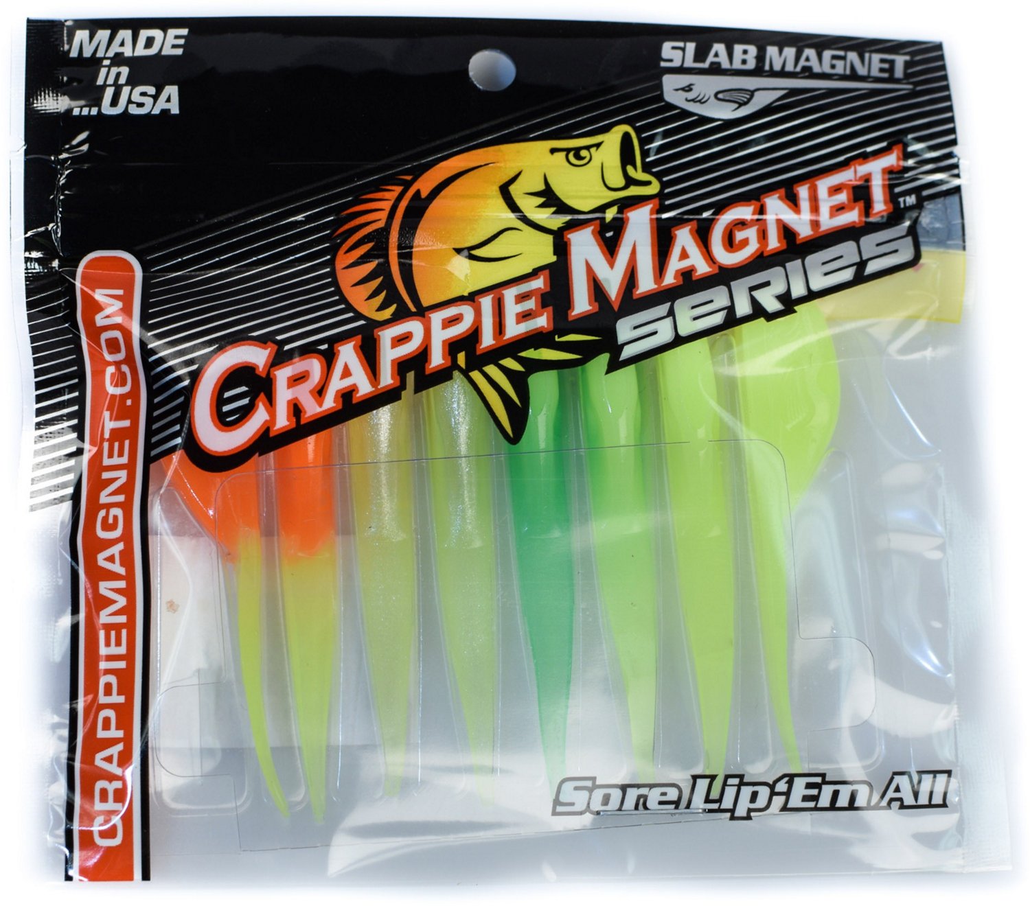 With a wide body and flat tail, the Leland Lures Fin Commander Slab Magnet Lures 8-Pack are made to draw in large fish in tournament situations. The pinch-and-pull tray helps keep the tails in place. Made in USA.
