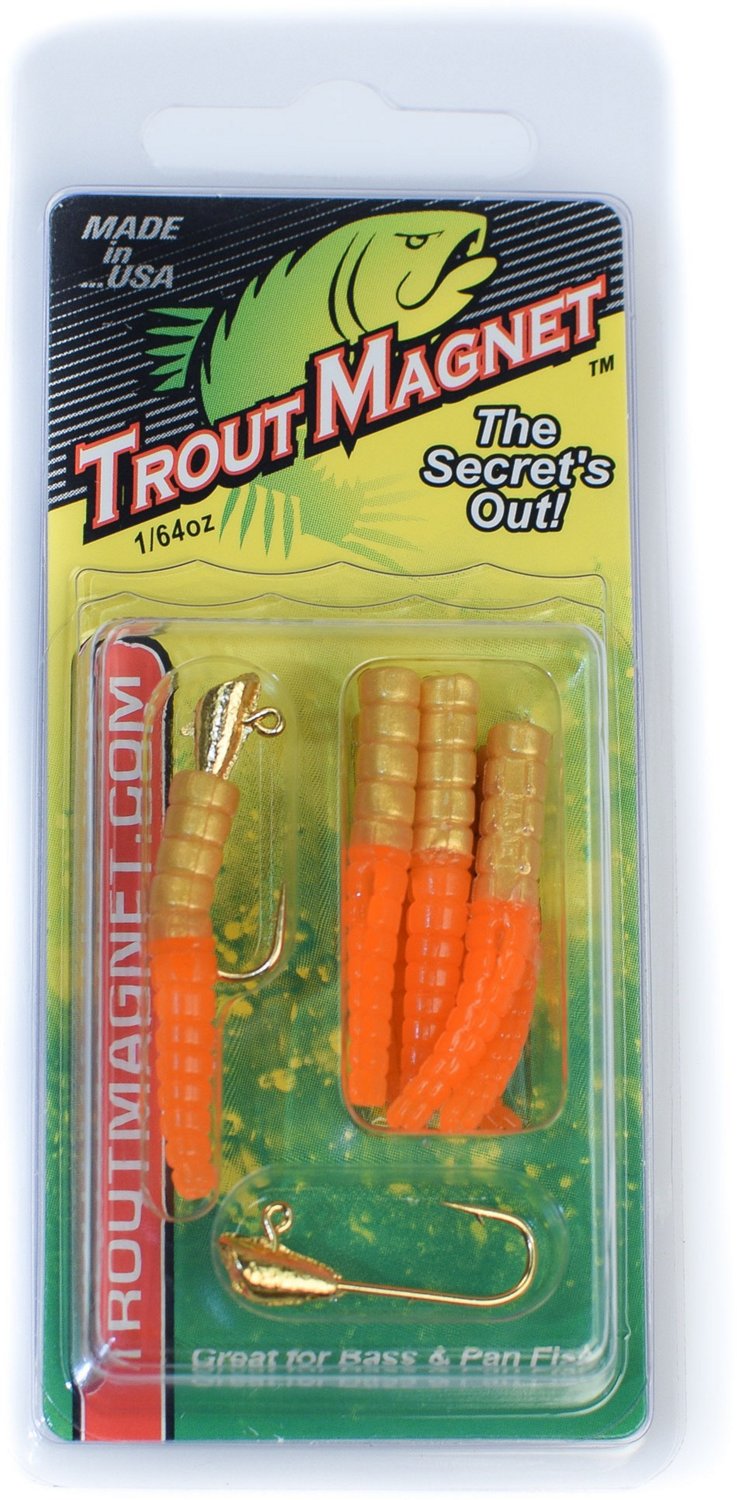Draw the attention of trout and more with the naturally flowing movement of the Leland Lures Trout Magnet Bait. The shad dart head and split-tail grub design offer a horizontal falling action. Weighs .016 oz.