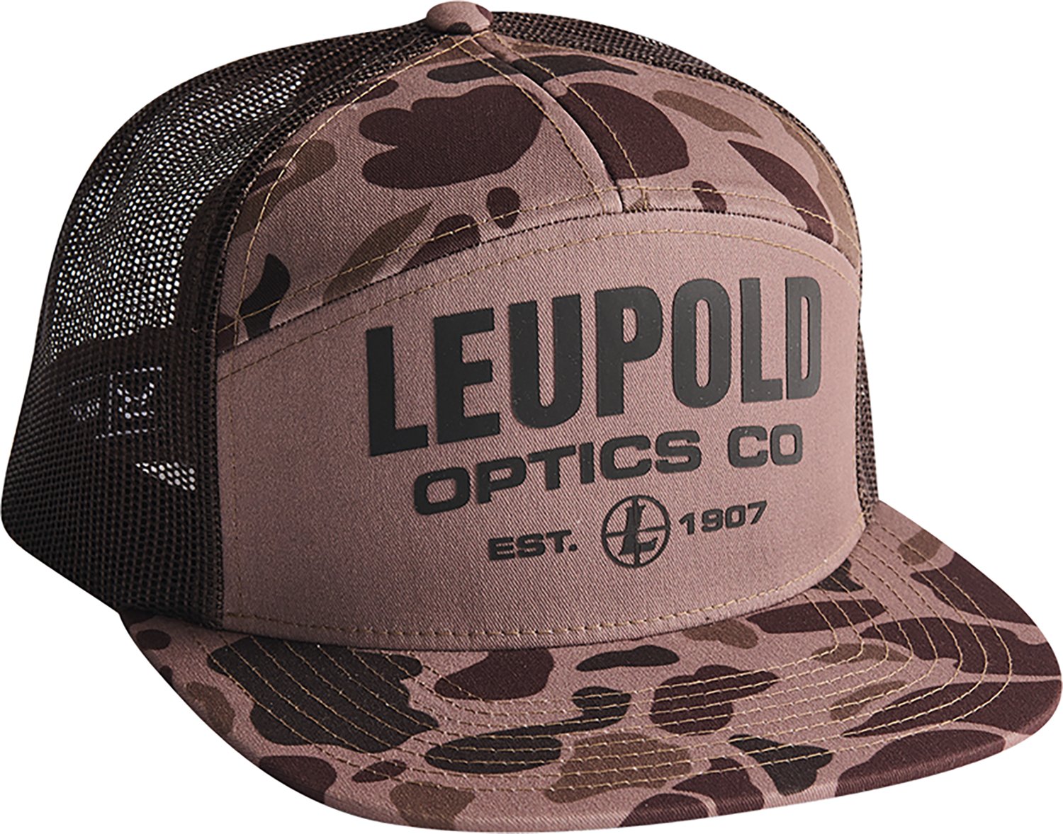 Get ready for the hunt with the Leupold Men's Bark Duck Camo 7 Panel Trucker Hat. The cotton and polyester material provides a comfortable feel, while the bark duck camo print and graphic design deliver a stylish look.