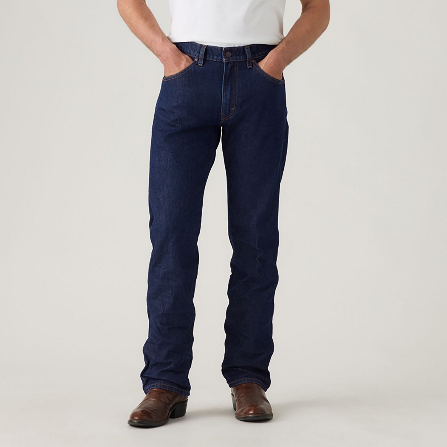 Get going with the Levi's Men's 557 Western Straight Jeans. The cotton and LYCRA material provides a comfortable feel, while the high rise waist offers coverage. The straight leg opening easily fits over your boots.
