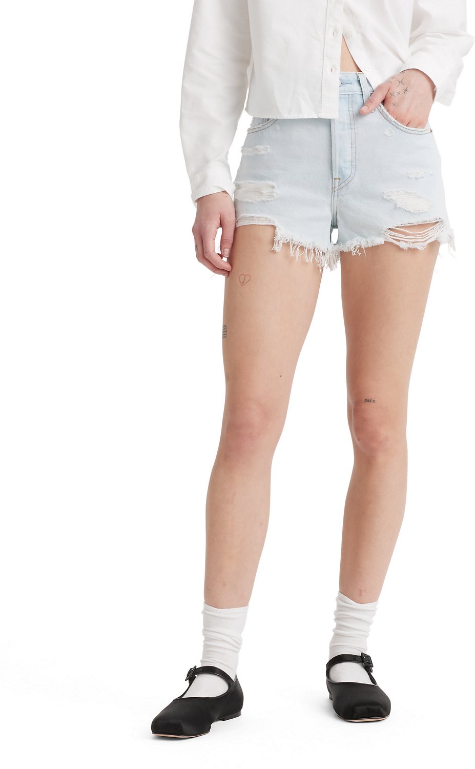 Show off your style with ease when you wear the Levi's Women's 501 Original High Rise Shorts 2.5 in. The 5 pockets securely store your items, and the 100% cotton fabric offers a soft feel. A vintage-inspired design highlights an eye-catching appearance.
