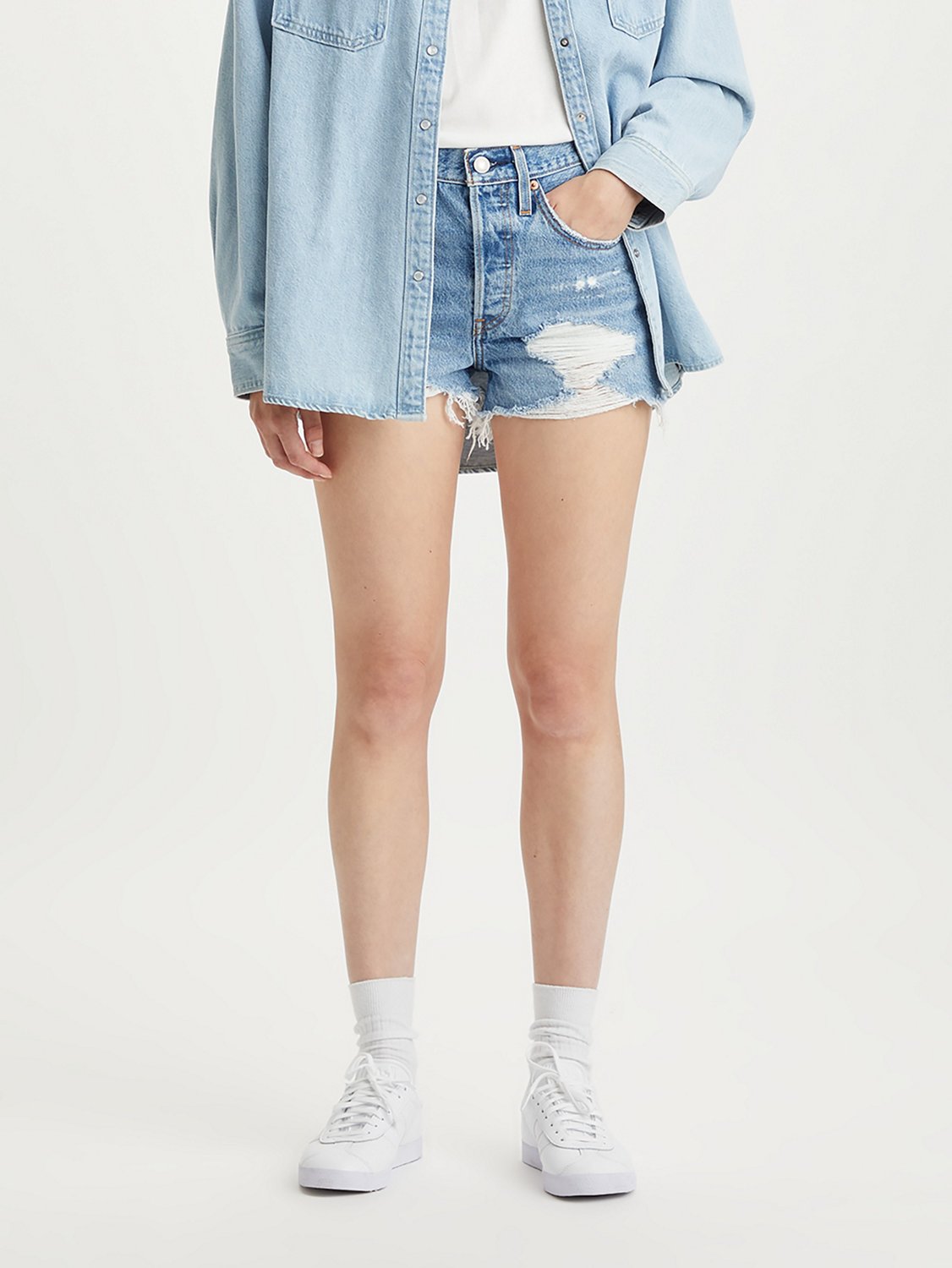 Show off your style with ease when you wear the Levi's Women's 501 Original High Rise Shorts 2.5 in. The 5 pockets securely store your items, and the 100% cotton fabric offers a soft feel. A vintage-inspired design highlights an eye-catching appearance.